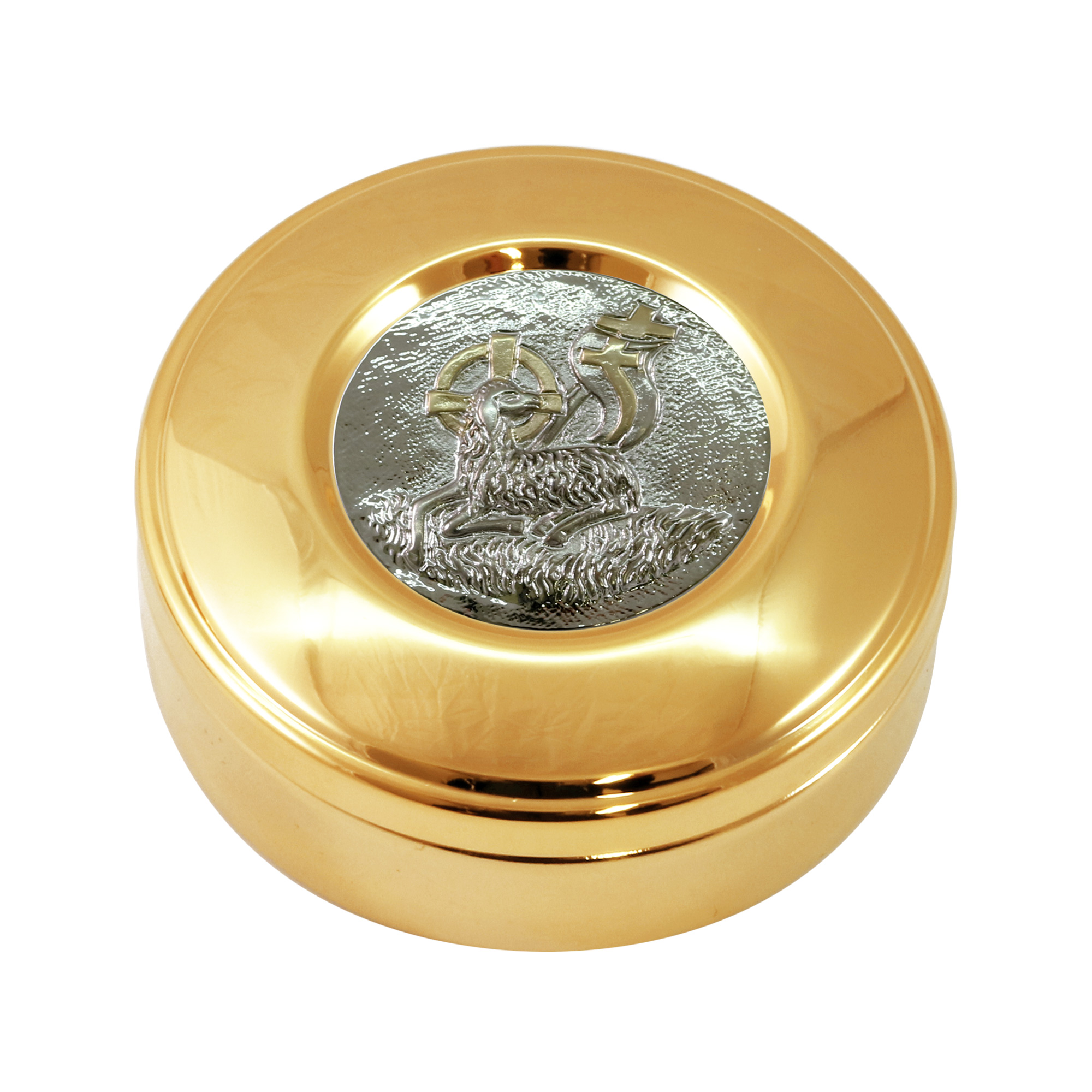 - Gold-plated brassHost box with decorative plaque. The Pyx has a diameter of 8 cm and holds approximately 40 hosts.