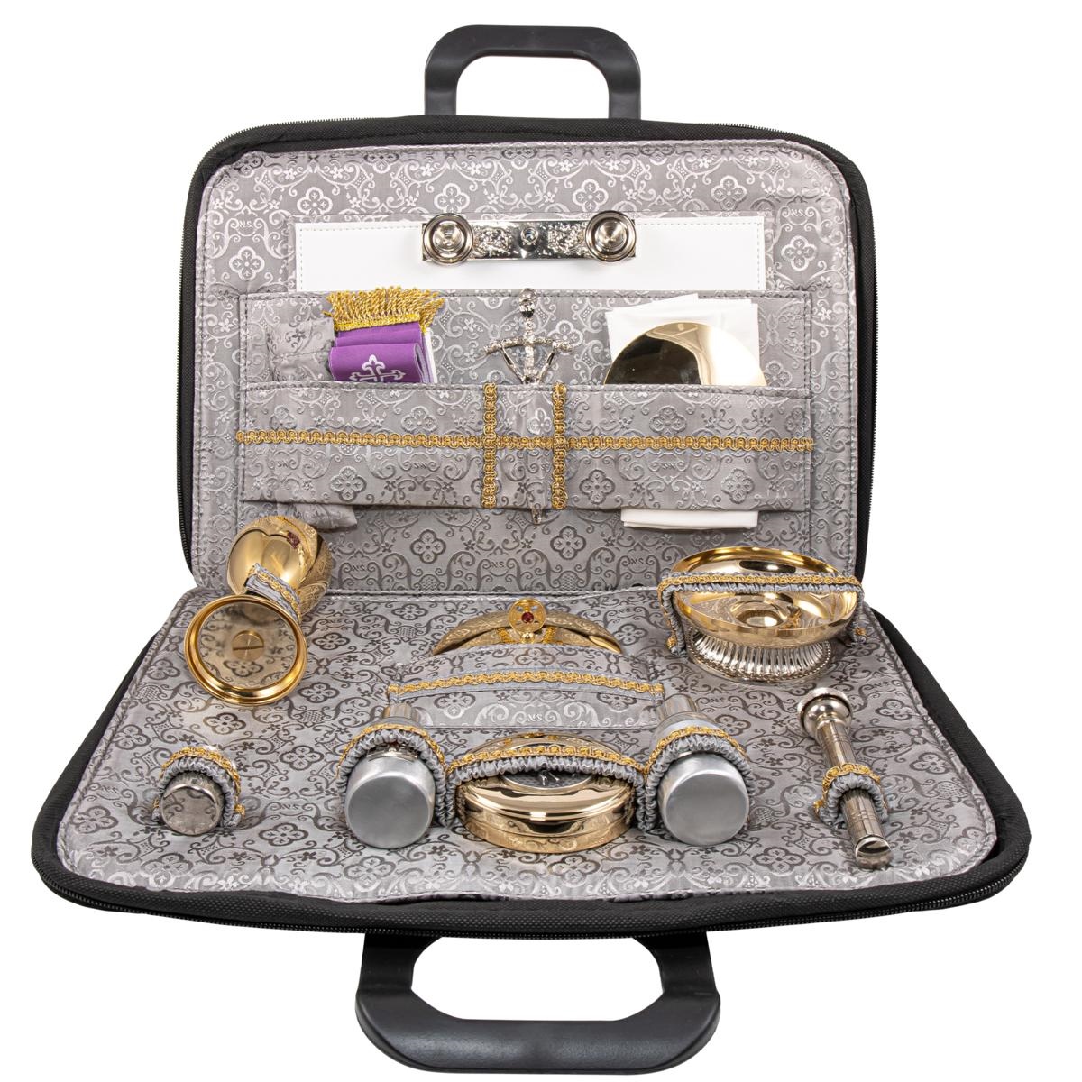 Cartella in Pelle Ecologica con tracolla salvaspalla, internamente foderata in Raso grigio e completa di tutto il necessario per la Celebrazione.