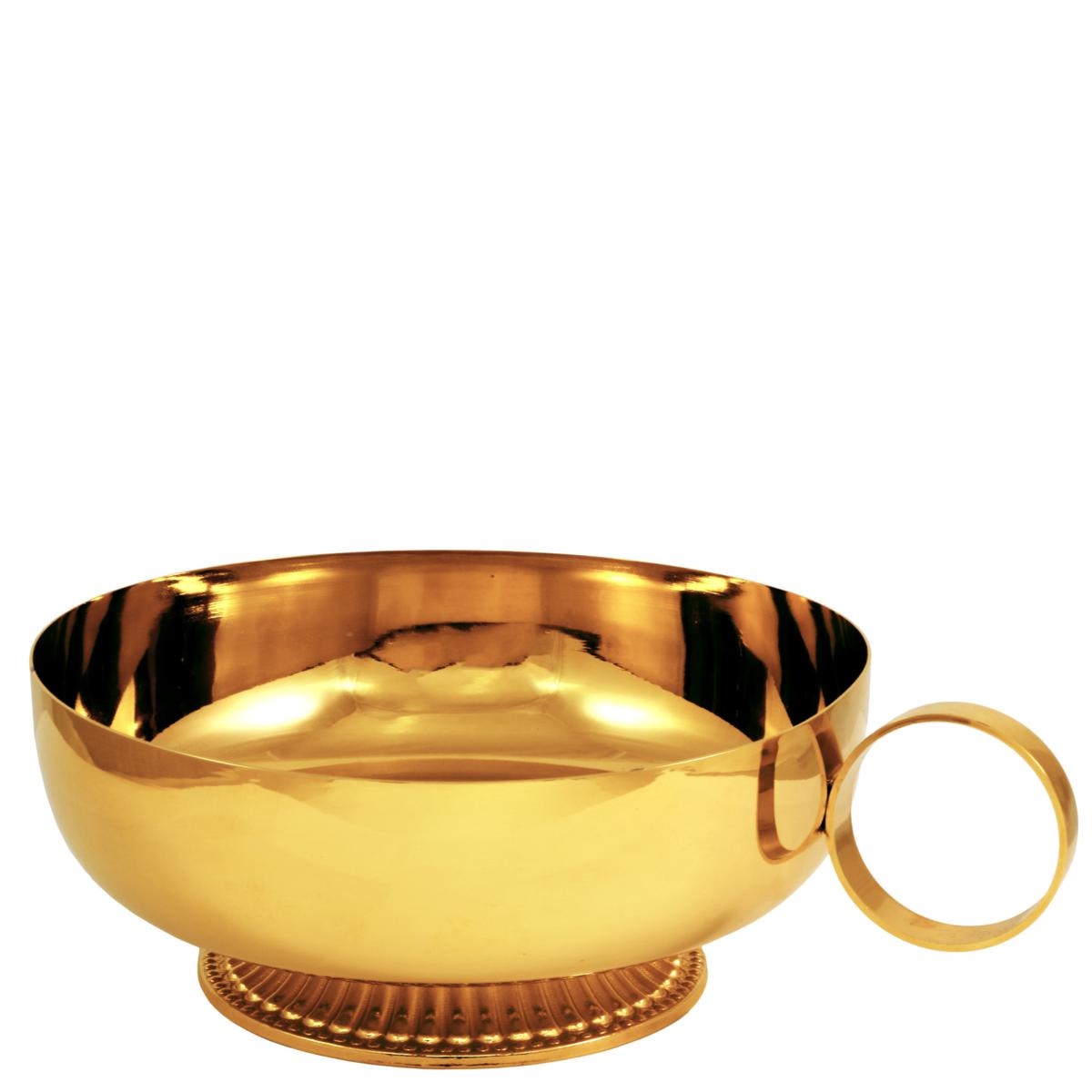 Ciotola in ottone dorato con base decorata con rigature e anello per una comoda impugnatura.