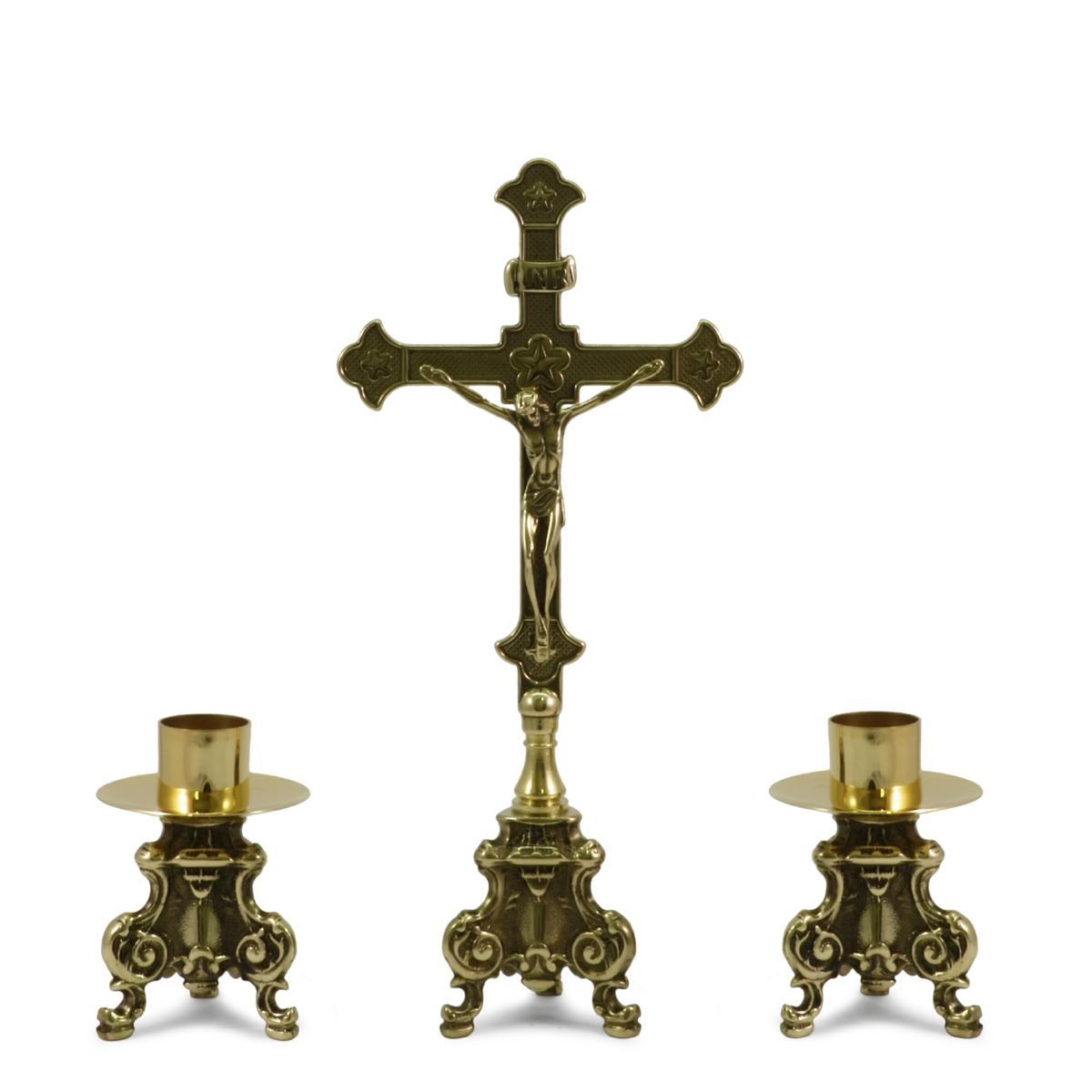 Croce e candelieri da altare in ottone brunito su base Rococò.