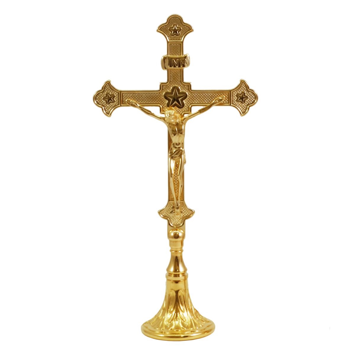 Altar cross and candlesticks in gold plated brass on a cast base with decorations. The cross is 29.5 cm high and the candlestick is 8.5 cm high with a 4 cm diameter liquid wax candle case It is possible to purchase the cross, the candlestick, or the complete set of the cross and two candlesticks.