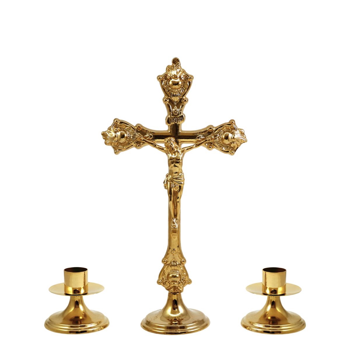 Croce e candelieri da altare in ottone dorato su base semplice.