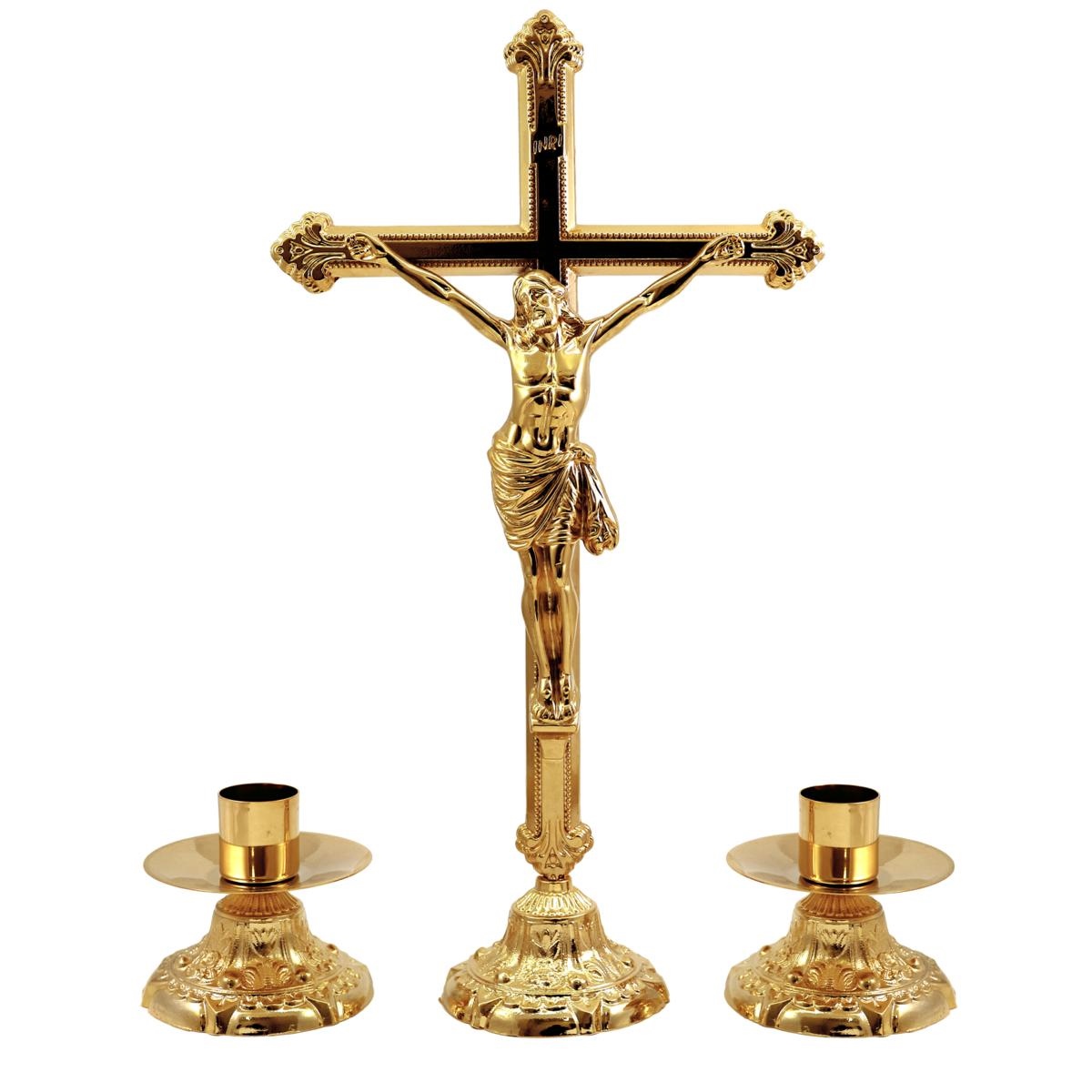 Croce e candelieri da altare in ottone dorato su base barocca.