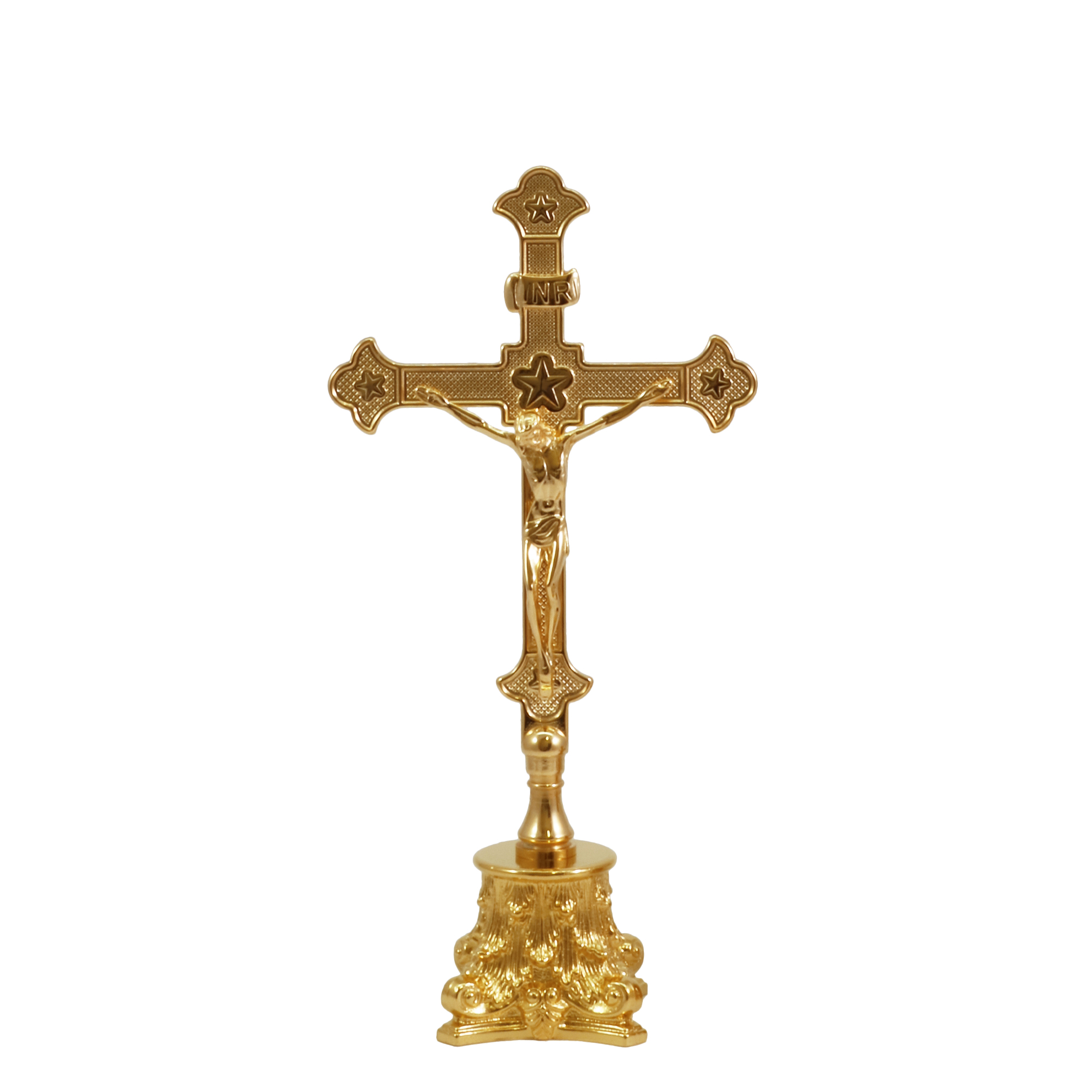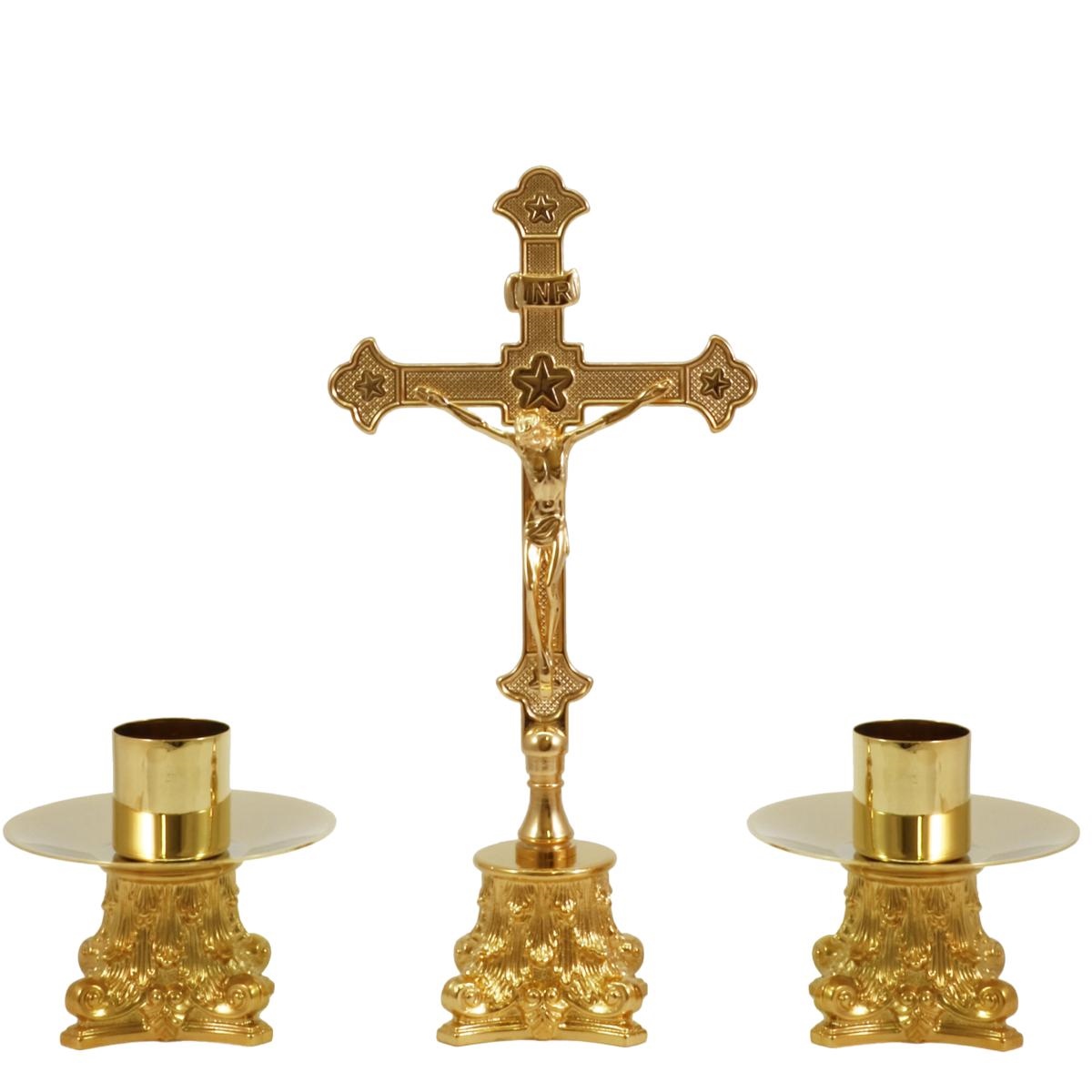 Croce e candelieri da altare in ottone dorato su base capitello.