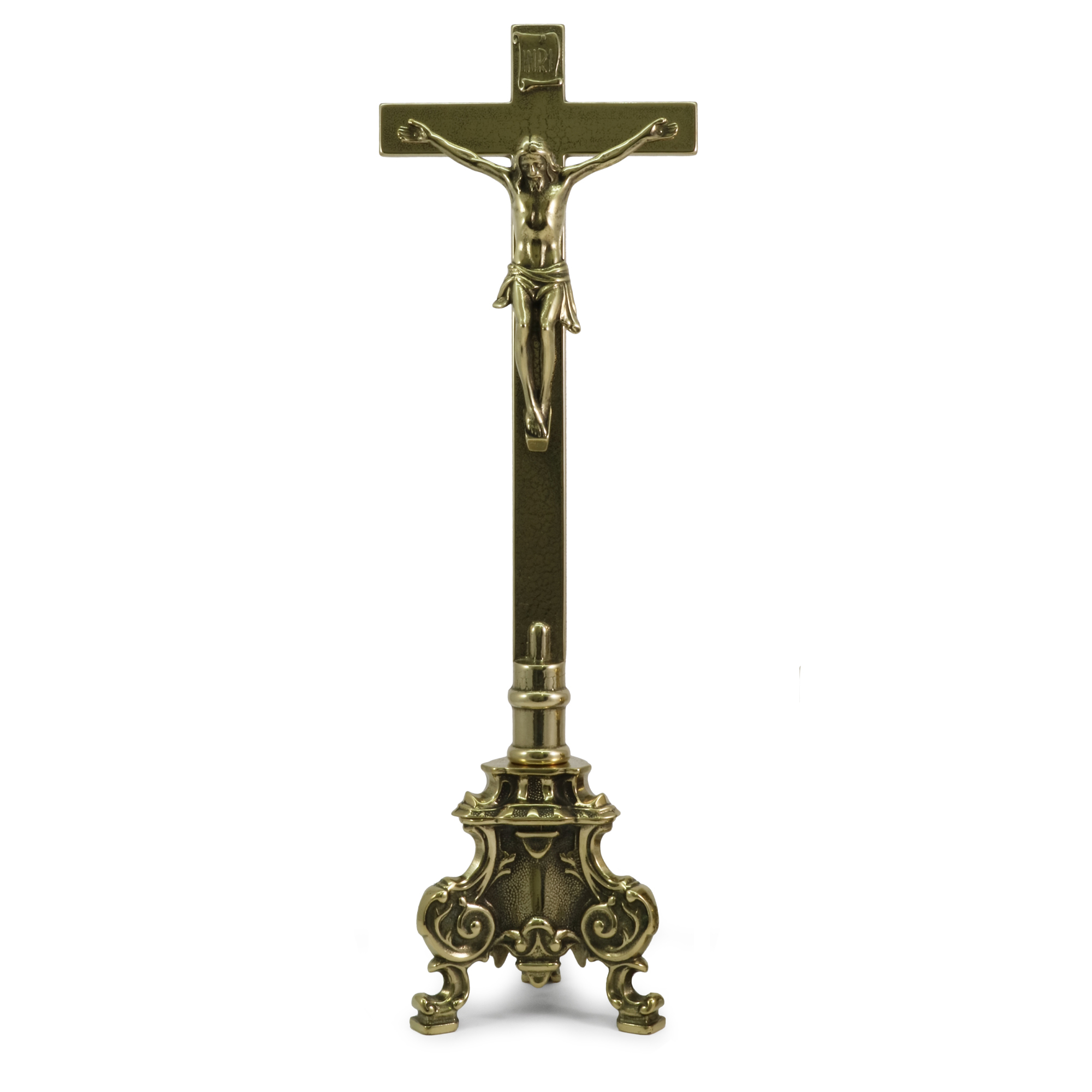 La Croce ha un altezza 45 cm. e il candeliere è alto 15,5 cm. con bossolo per candela a cera liquida da Ø 4 cm.