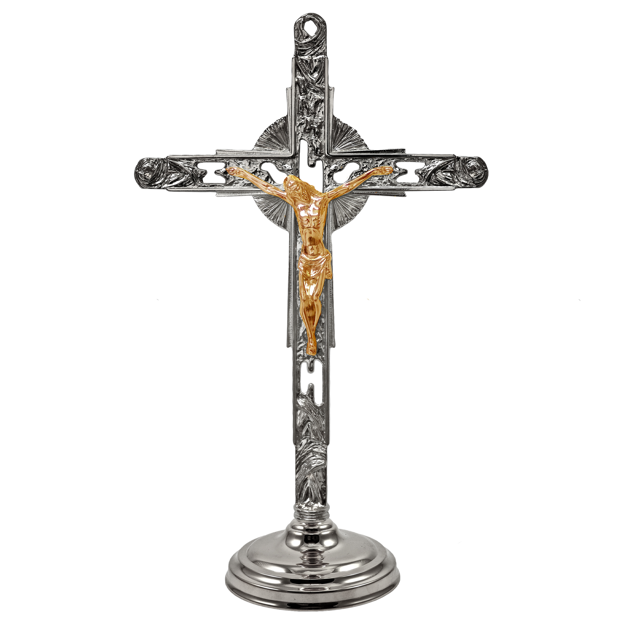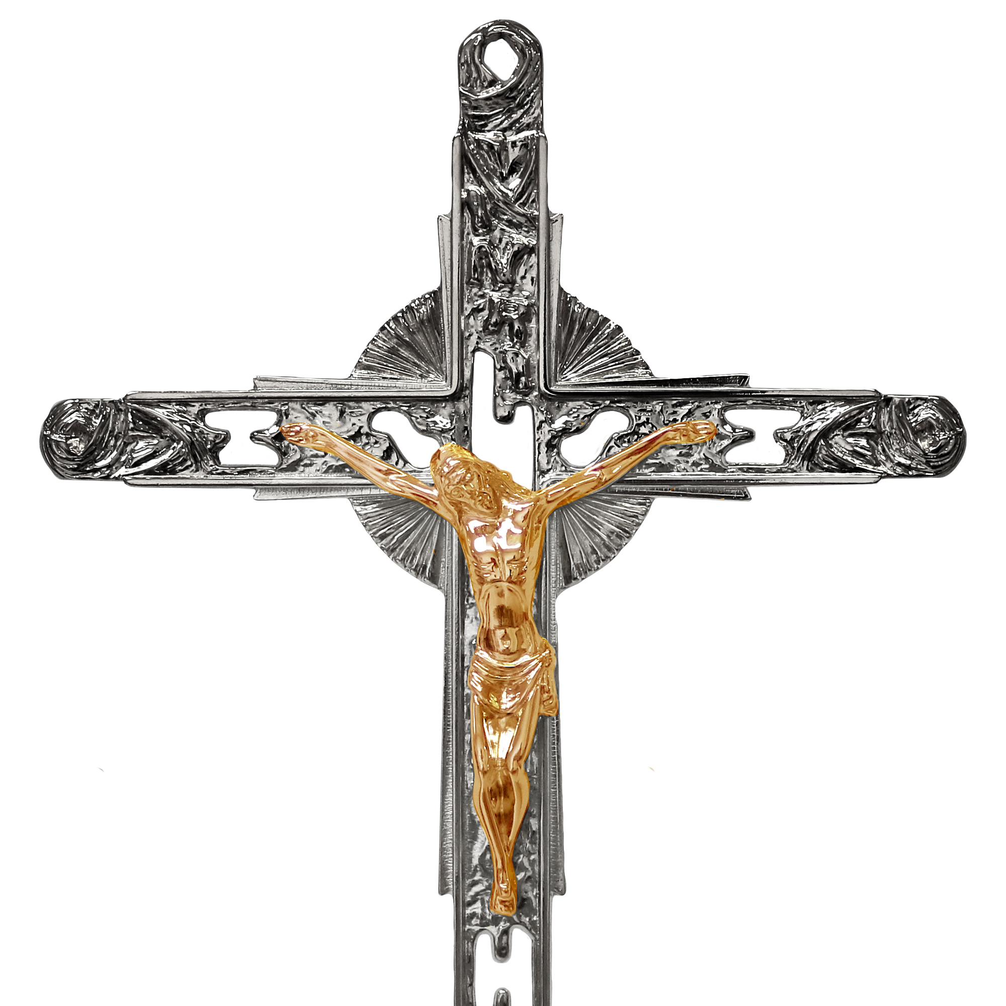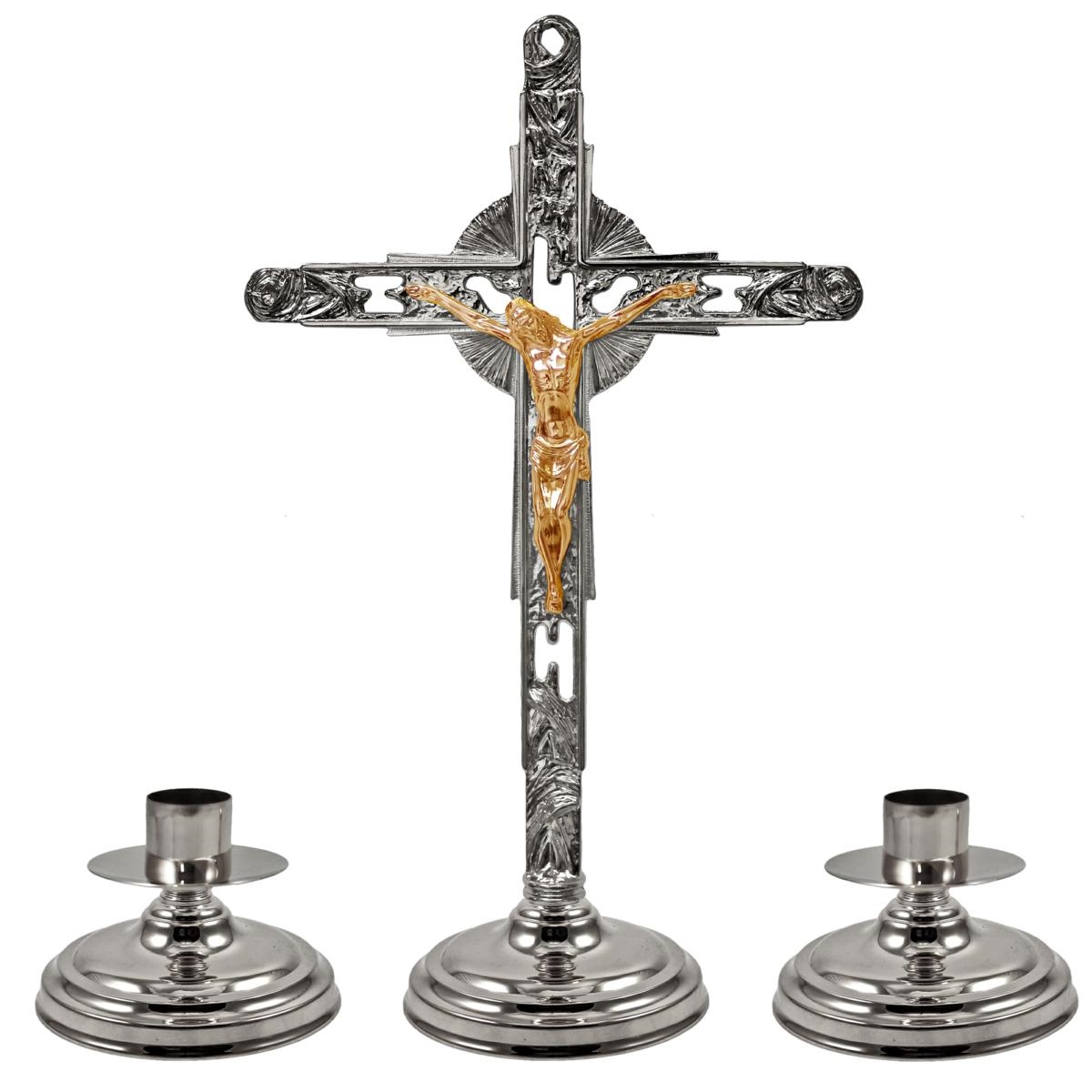 La Croce ha un altezza 57 cm. ed è in finitura tono argento con il corpo del Cristo dorato. Il candeliere è alto 10,5 cm. con bossolo per candela a cera liquida da Ø 4 cm.