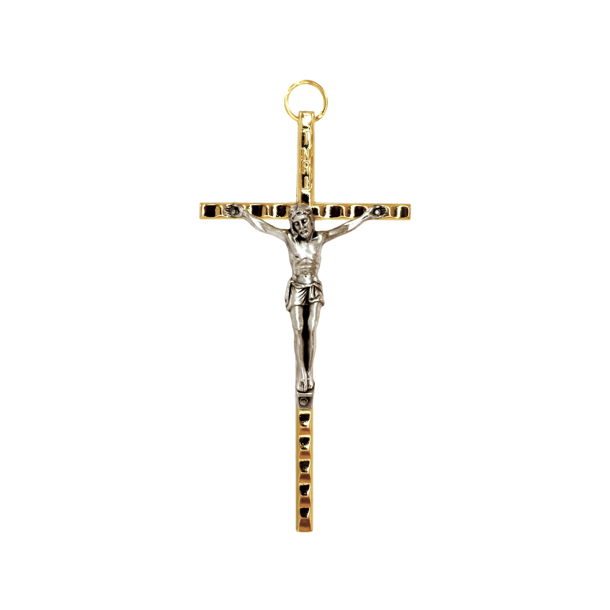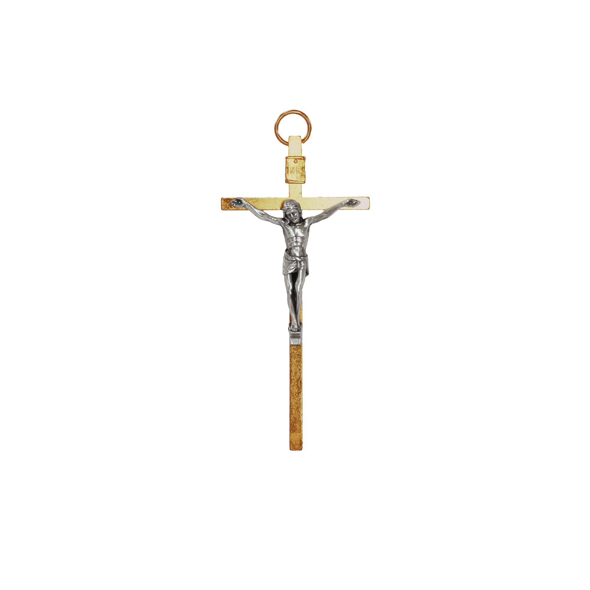 Croce in ottone dorato con corpo in argentato. Dotata di anellino per metterla al collo.