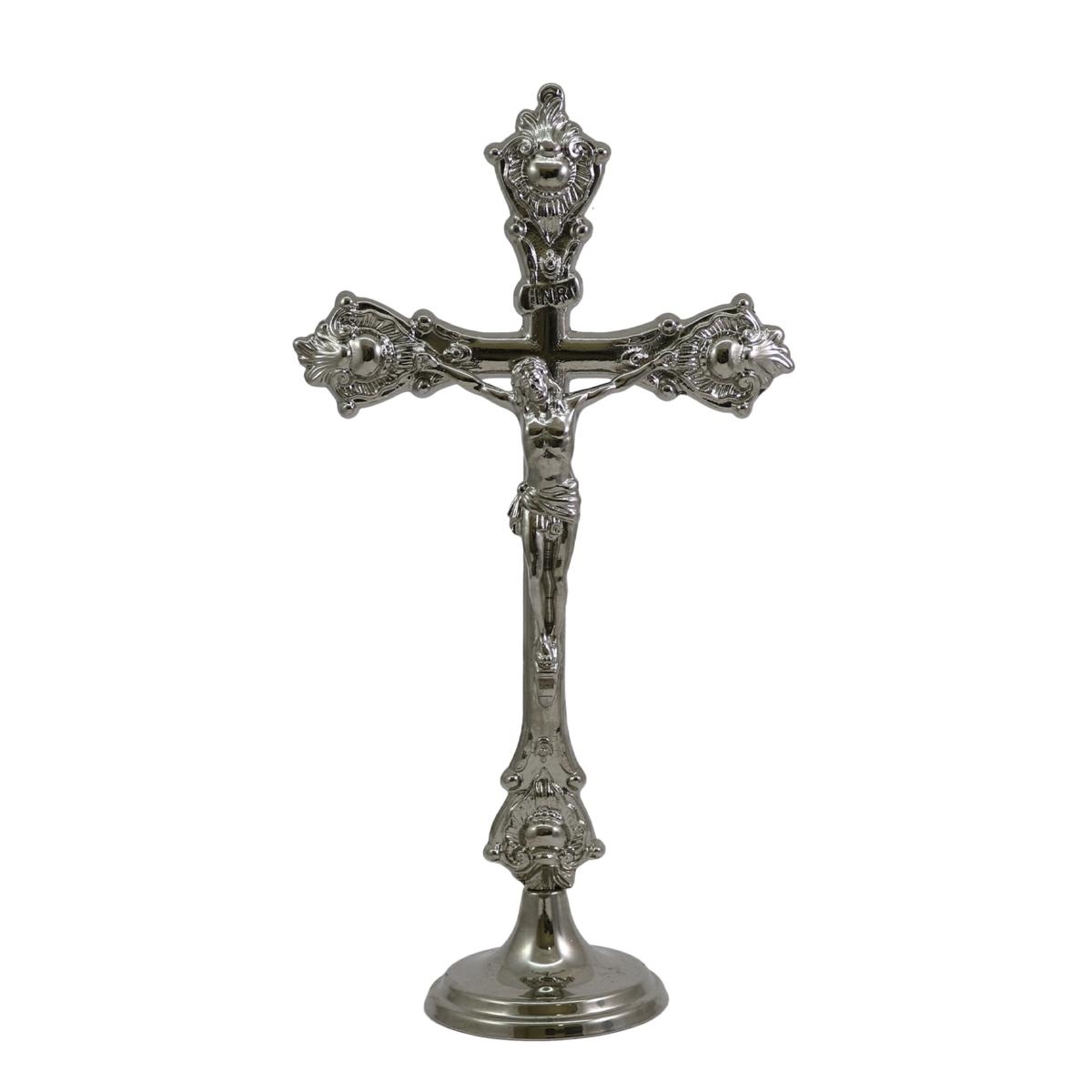 Altar cross and candlesticks in brass with a silver-tone finish.