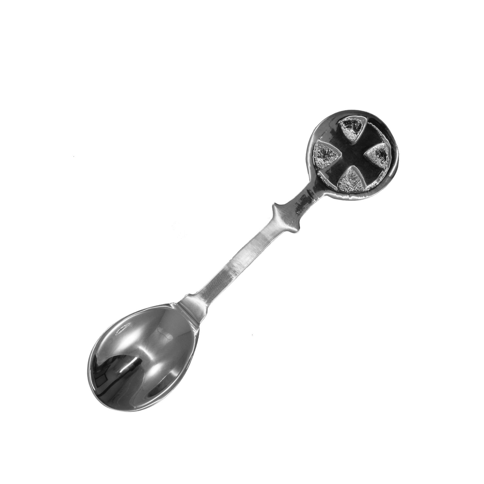 Cucchiaino in ottone tono argento per incenso. Sul fondo del manico è raffigurata una croce.