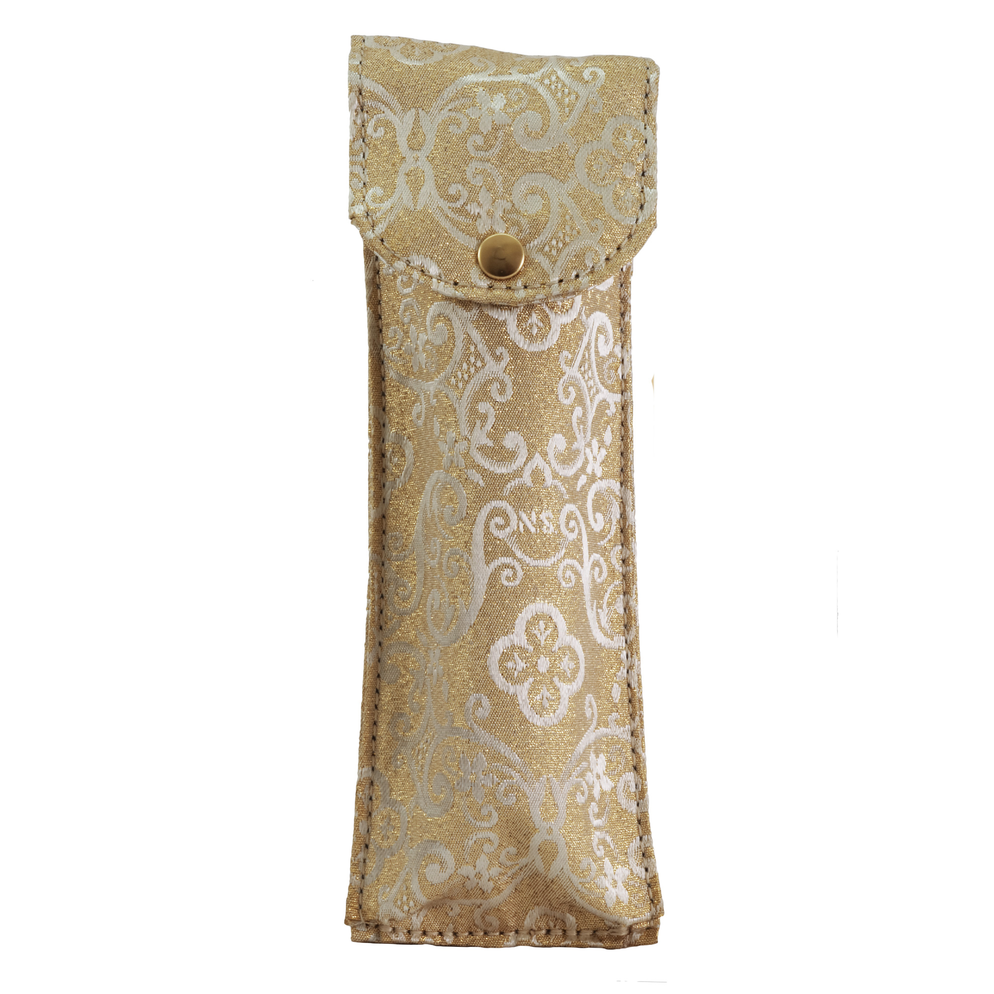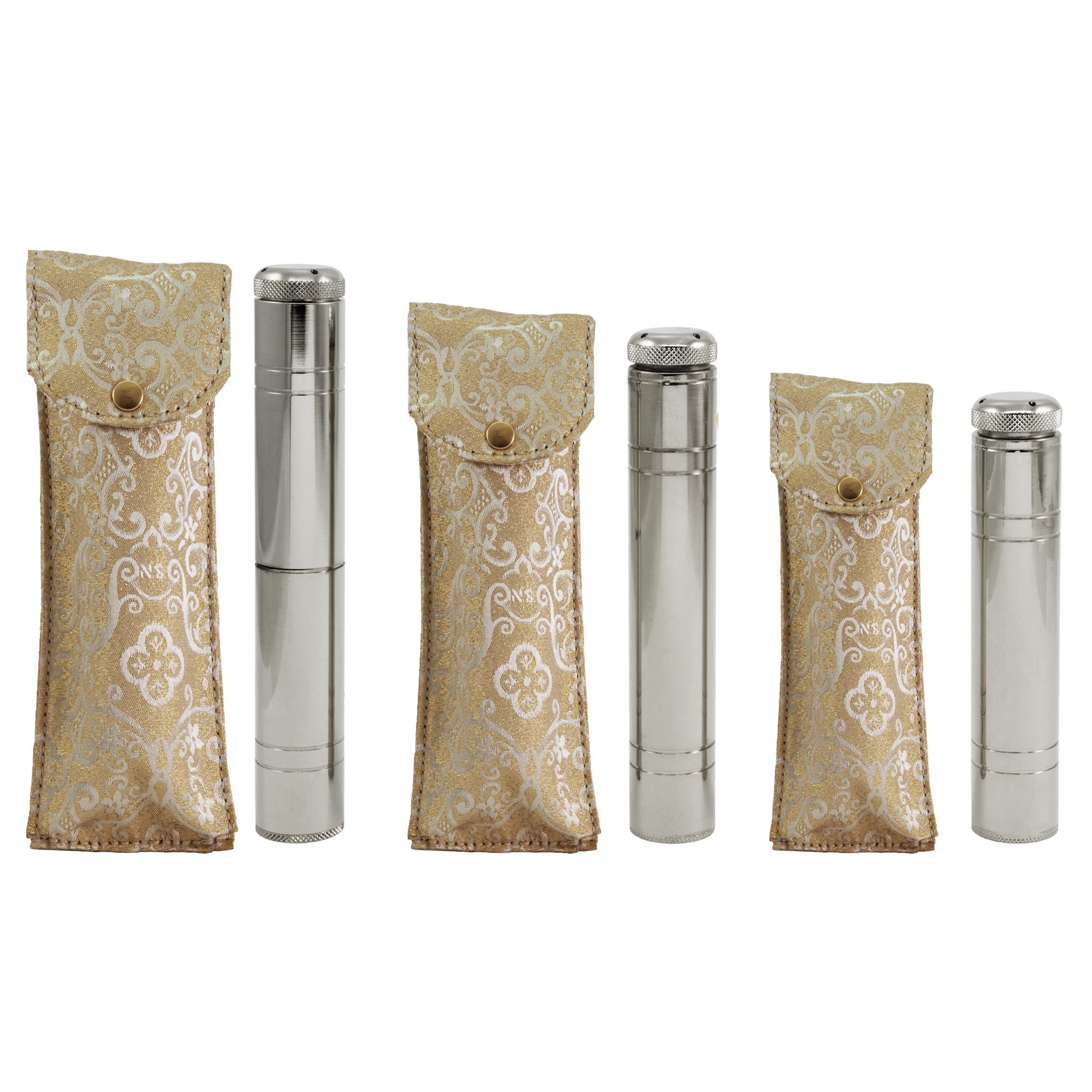 Custodia in raso damascato completa di asperges in ottone tono argento, con tappo svitabile per una facile ricarica.