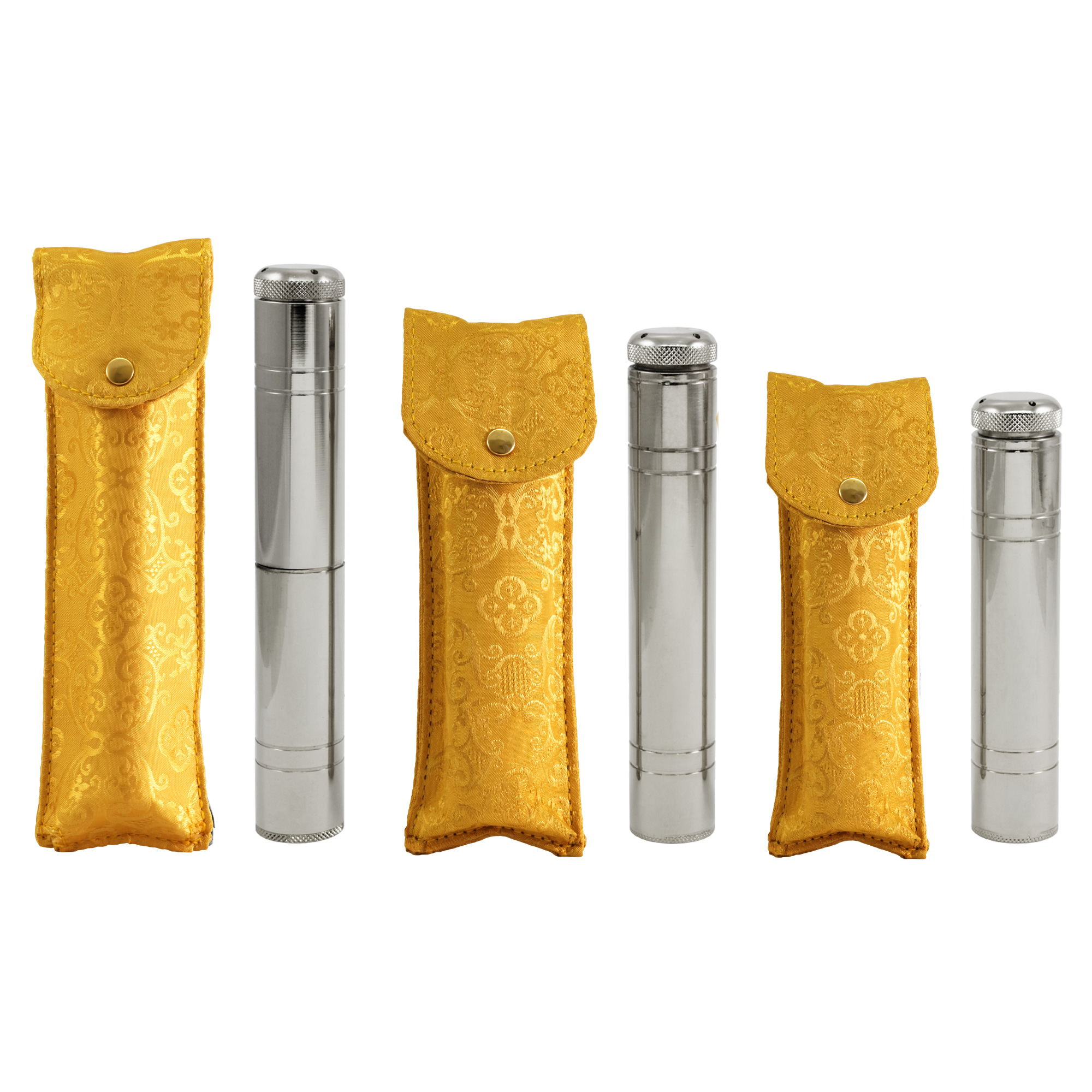Custodia in raso giallo completa di asperges in ottone tono argento, con tappo svitabile per una facile ricarica.