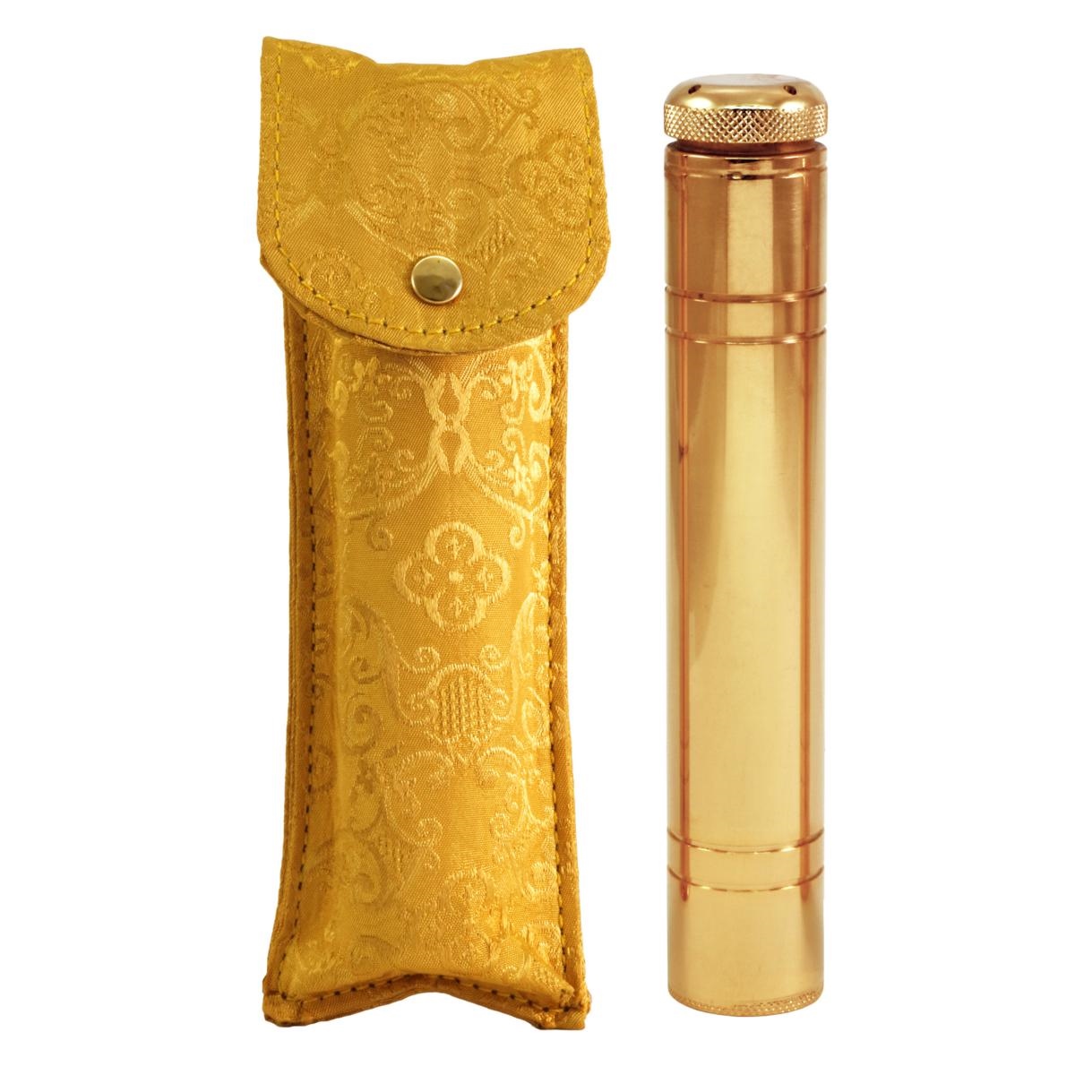 Custodia in raso giallo completa di asperges in ottone dorato, con tappo svitabile per una facile ricarica.
