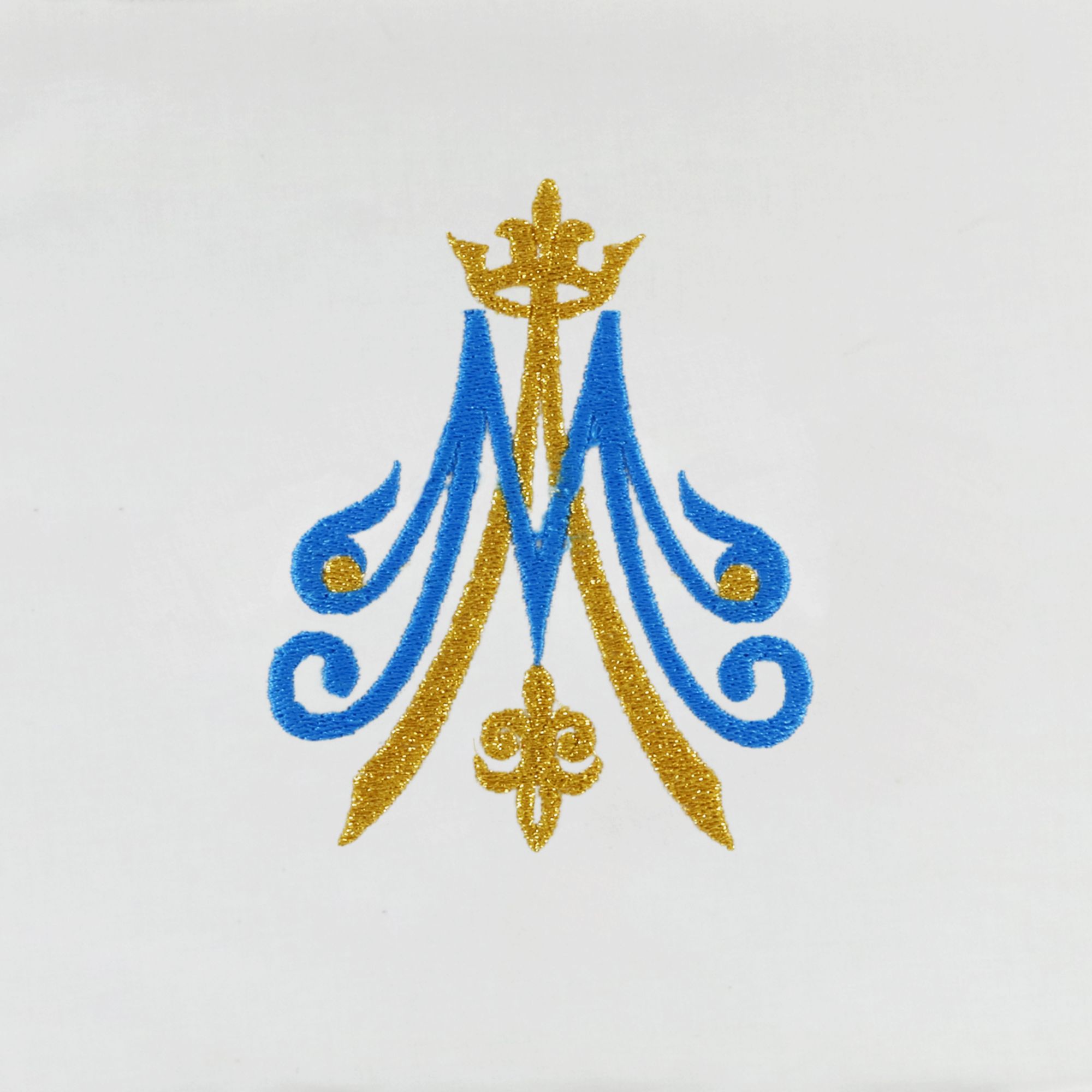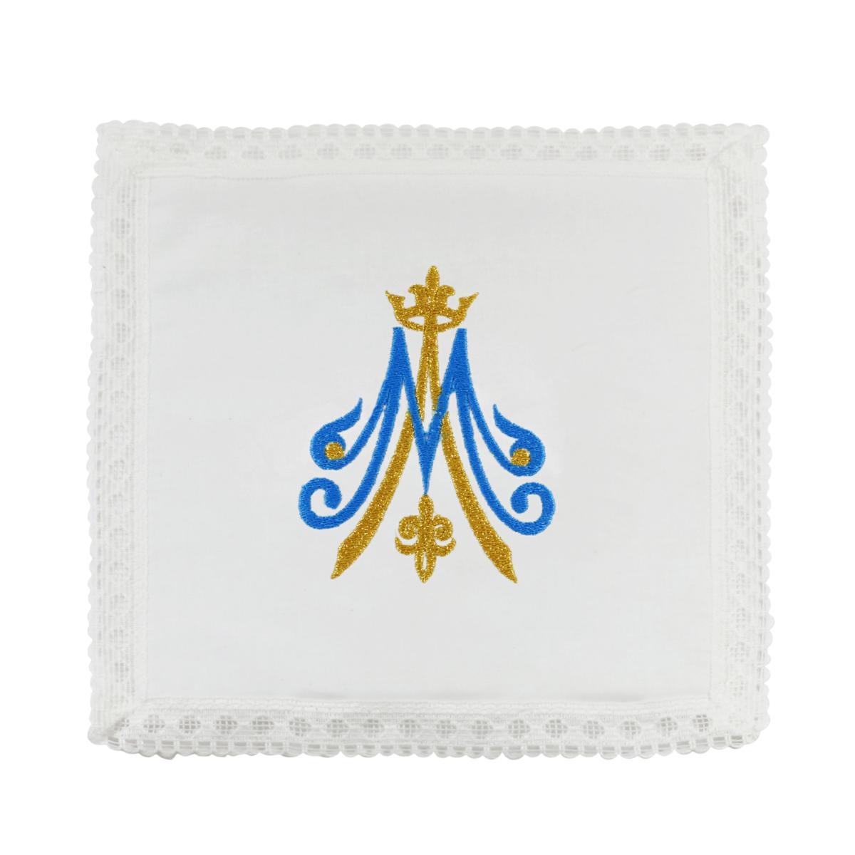 Palla rigida per calice 100% Cotone, con simbolo Mariano ricamato a filo blu e oro.