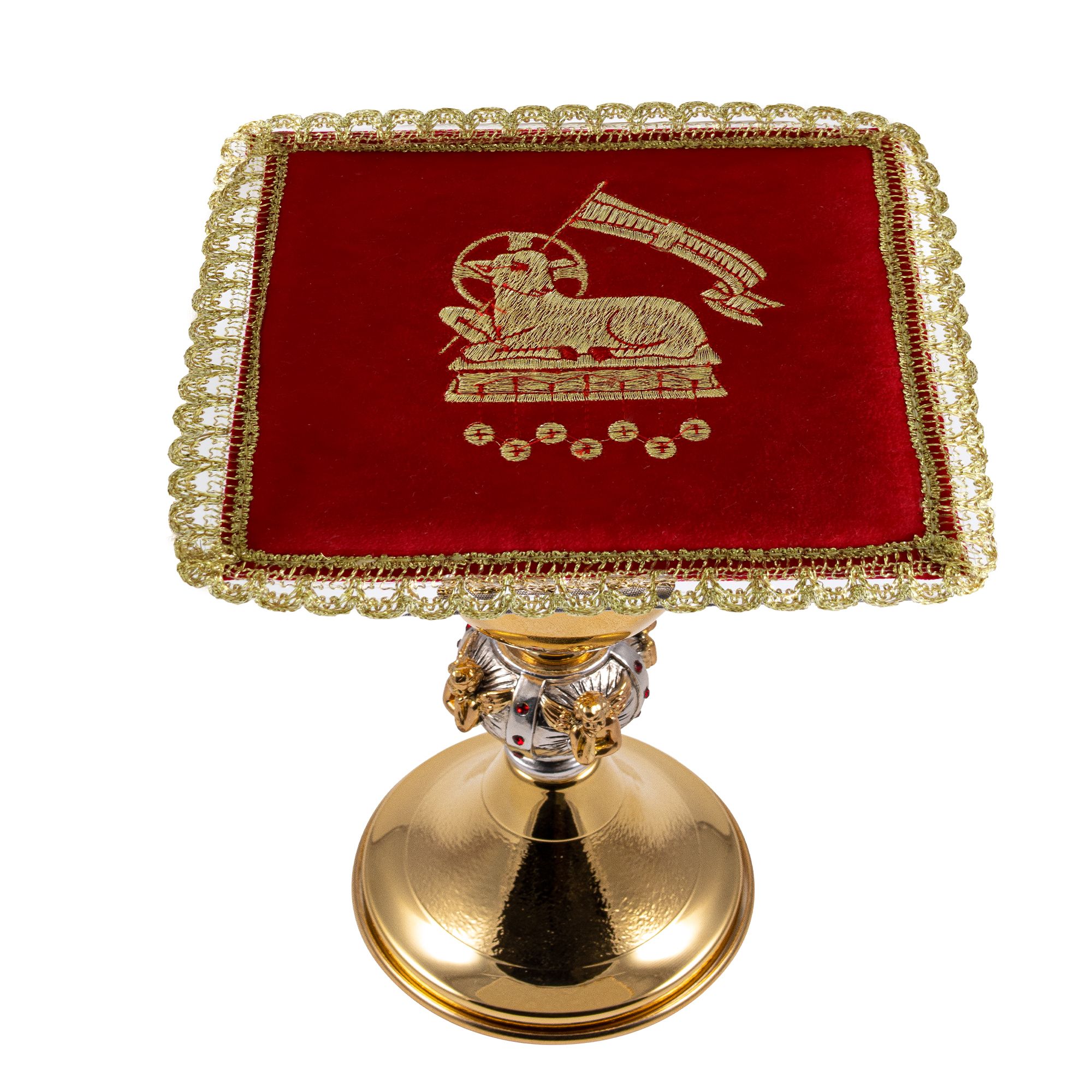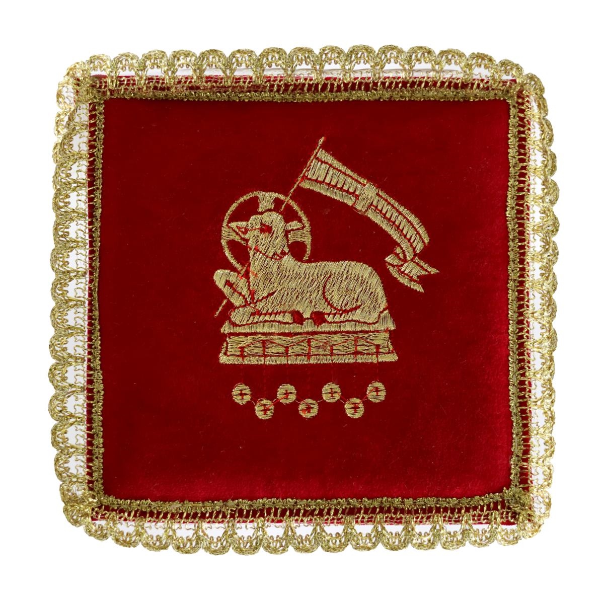 Palla rigida per calice rivestita in tessuto rosso tipo cavallino, con ricamo raffigurante l'Agnello di Dio che giace sul libro dei sette sigilli .
