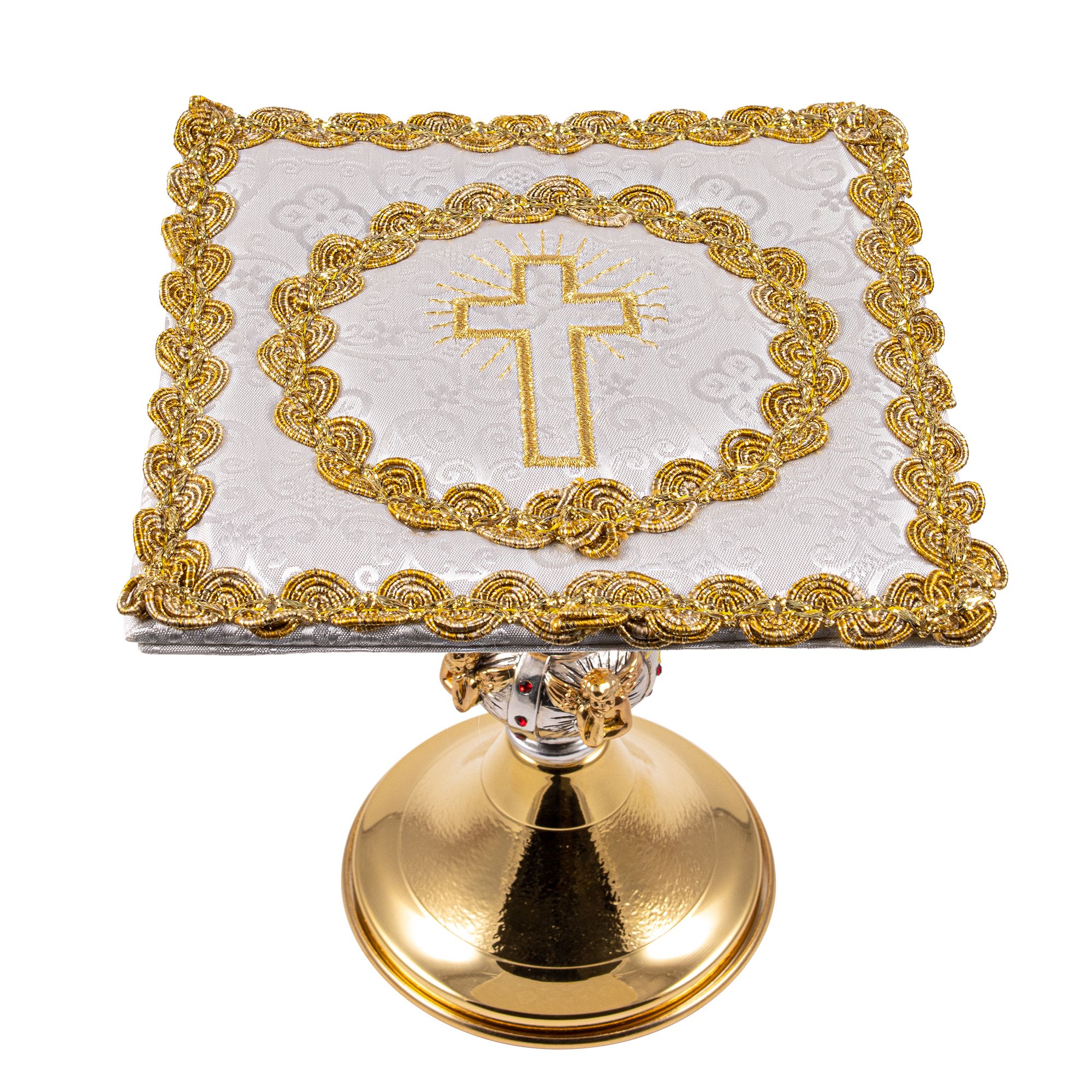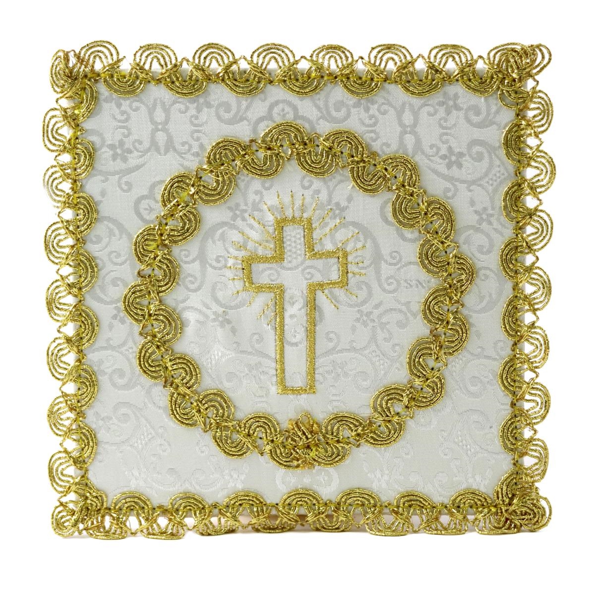 Palla rigida per calice rivestita in Raso bianco, con Croce ricmata a filo dorato.