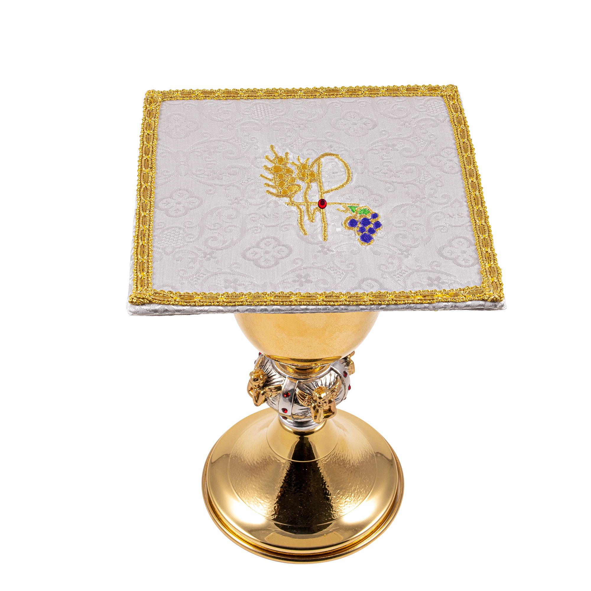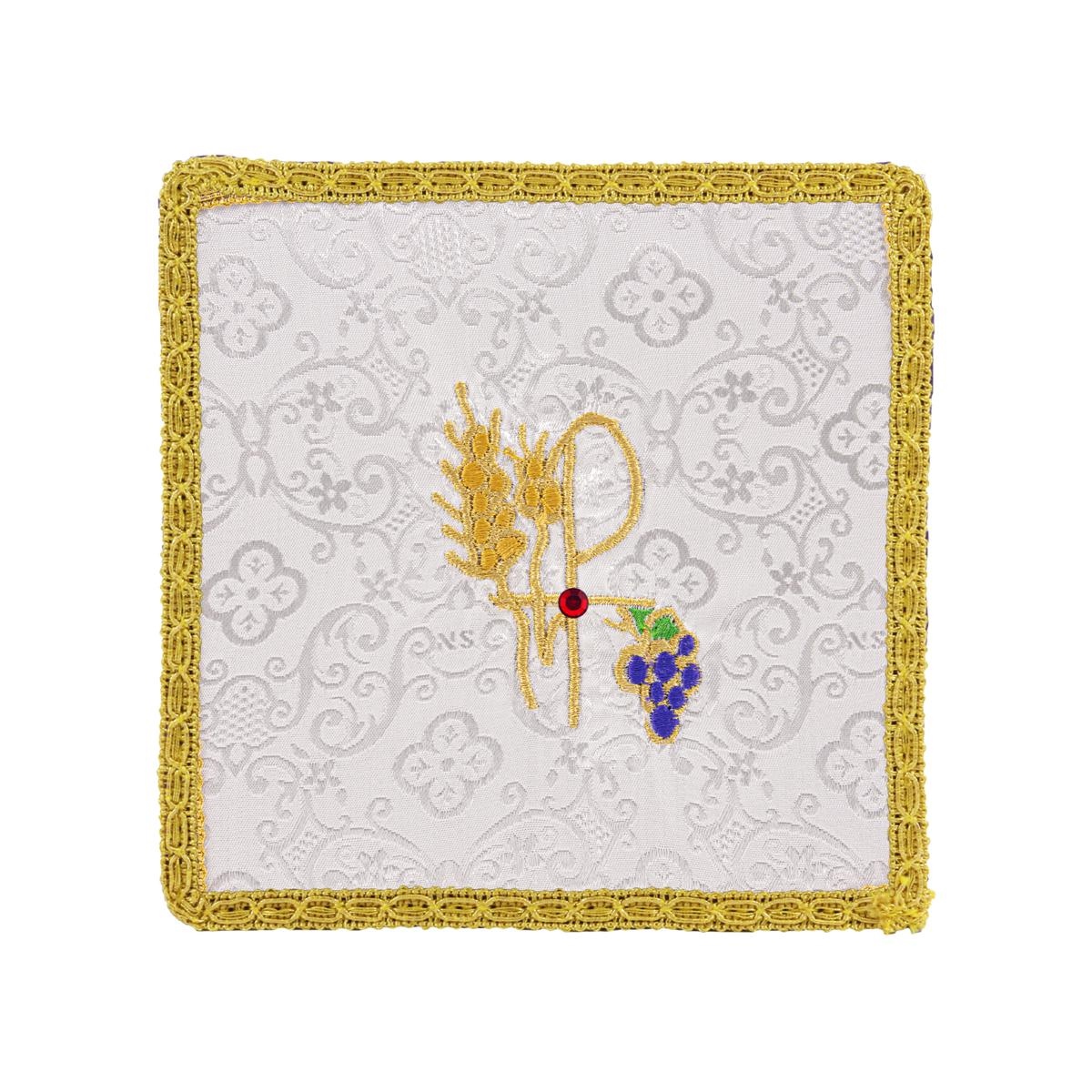 Palla rigida per calice rivestita in Raso bianco, con ricamo a filo dorato raffigurante il simbolo PX con Uva e Spiga di grano. Al centro è decorata con una pietra rossa.