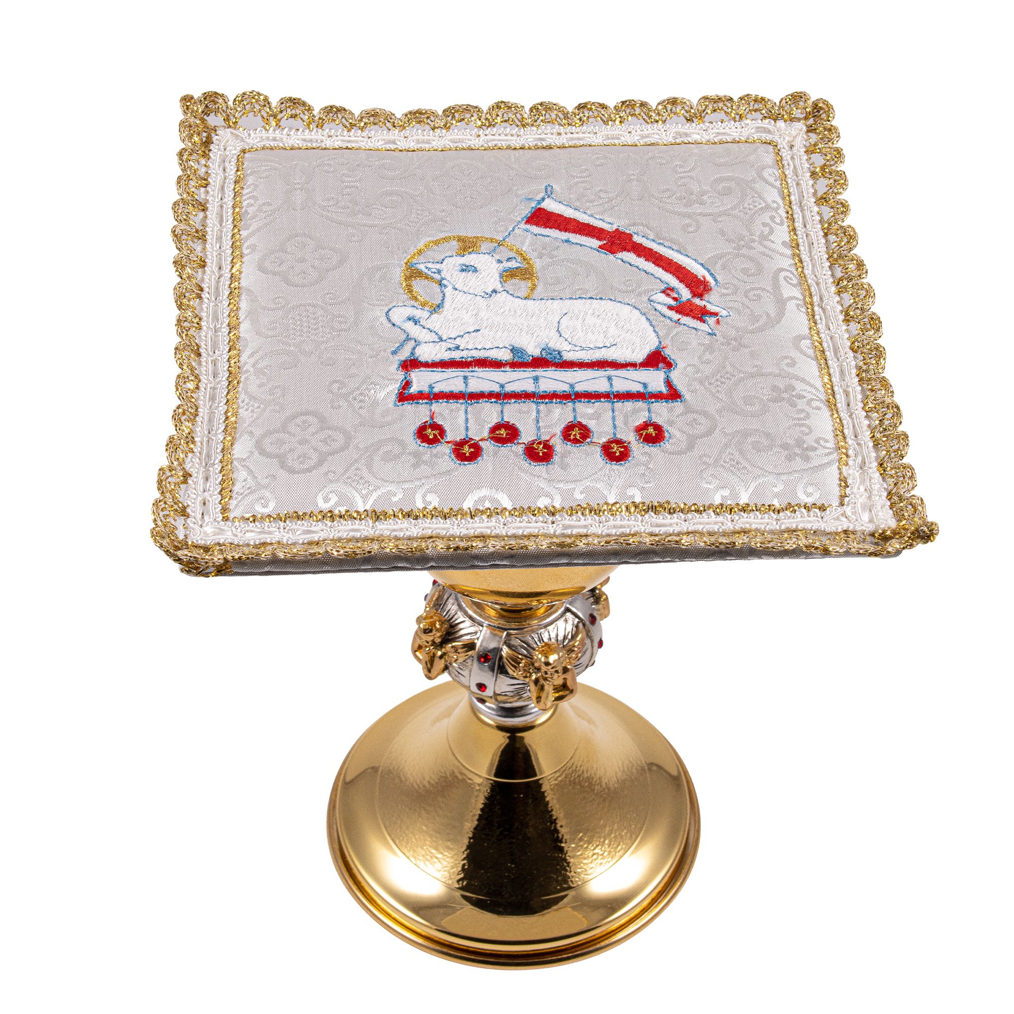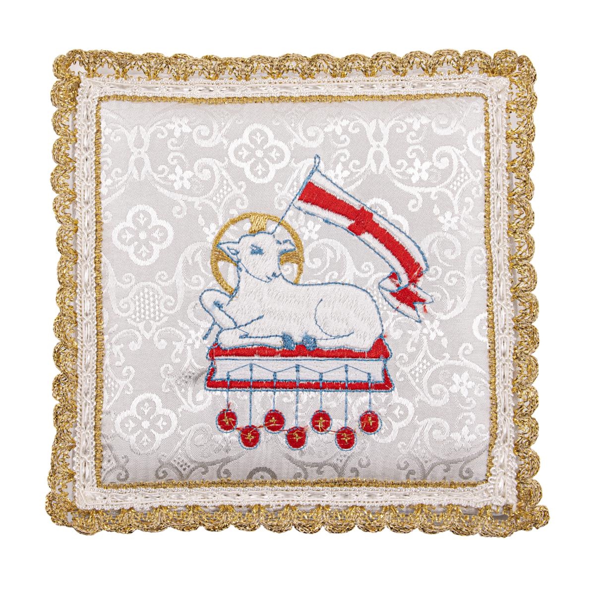Palla rigida per calice rivestita in Raso bianco, con ricamo raffigurante l' Agnello di Dio che giace sul libro dei sette sigilli .