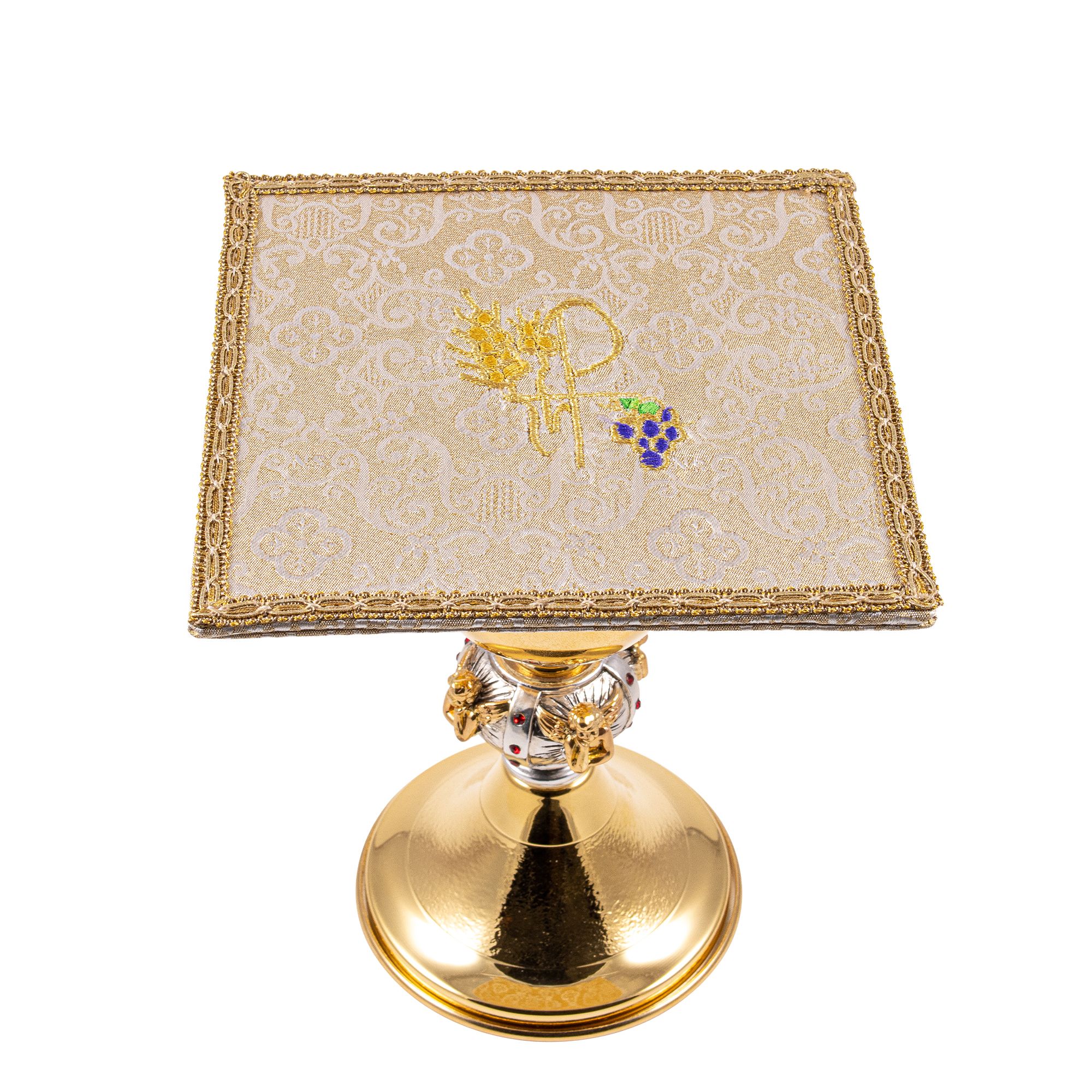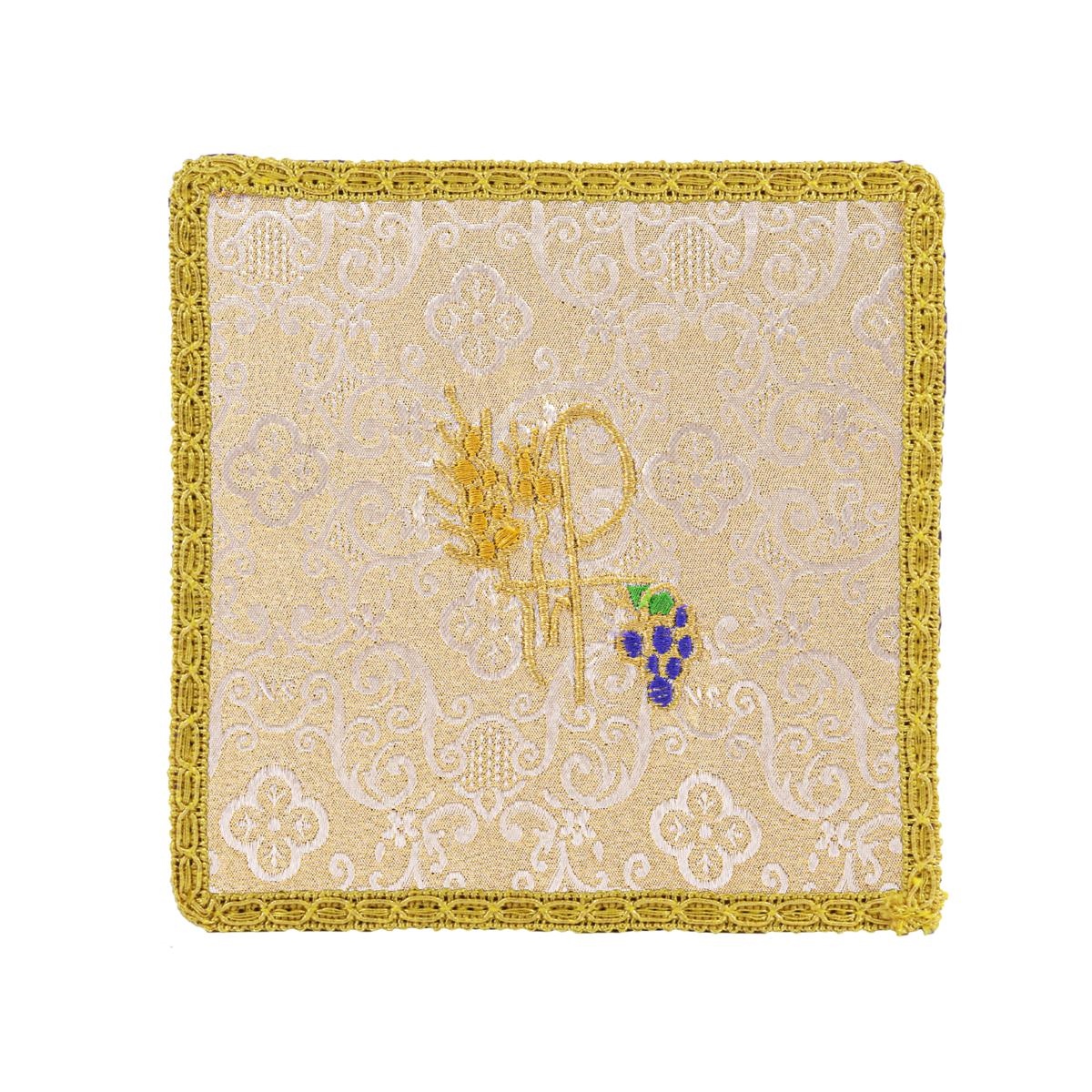 Palla rigida per calice rivestita in Raso damascato dorato, con ricamo a filo dorato raffigurante il simbolo PX con Uva e Spiga di grano.