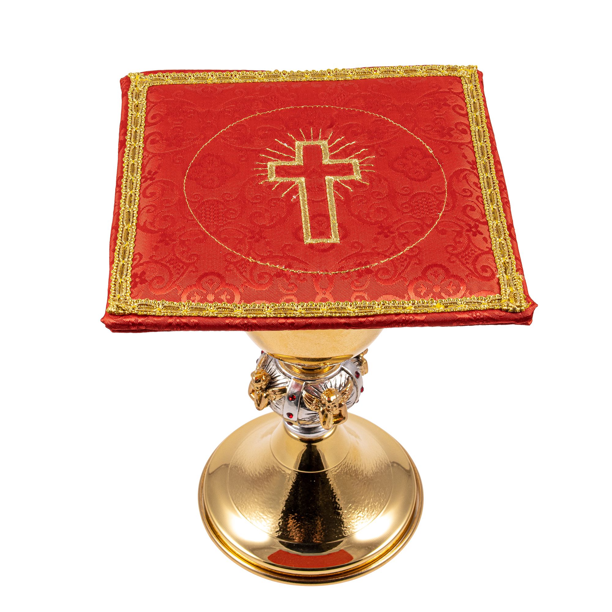 Palla rigida per calice rivestita in Raso rosso con Croce ricamata a filo dorato.