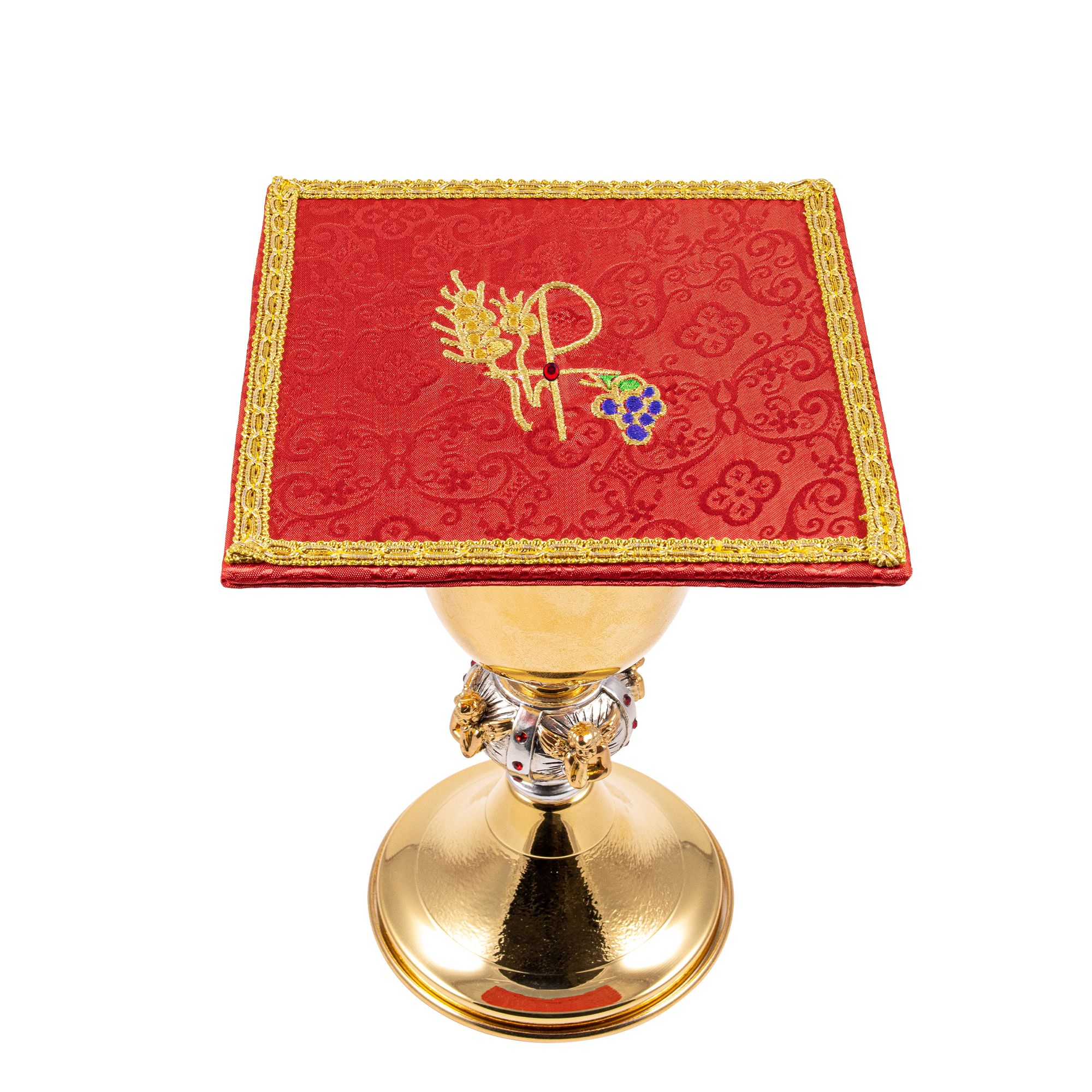 Palla rigida per calice rivestita in Raso rosso, con ricamo a filo dorato raffigurante il simbolo PX con Uva e Spiga di grano. Al centro è decorata con una pietra rossa.