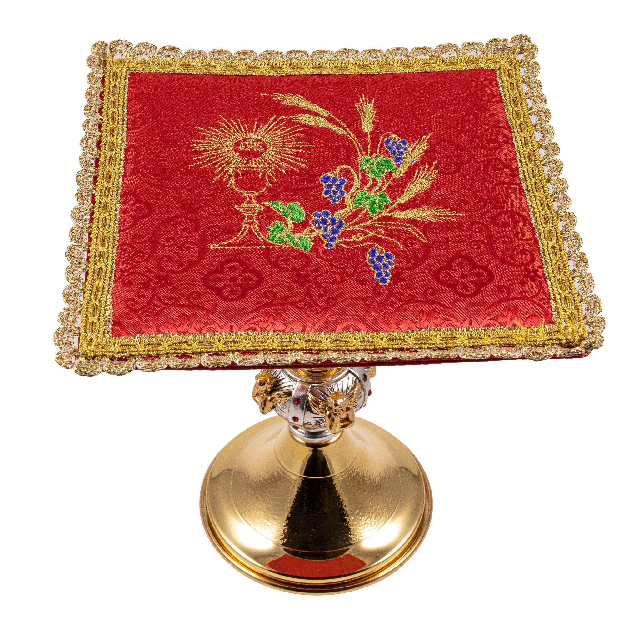 Palla rigida per calice rivestita in Raso rosso, con ricamo a filo dorato raffigurante un Calice con decori di Uva e Spighe di grano.