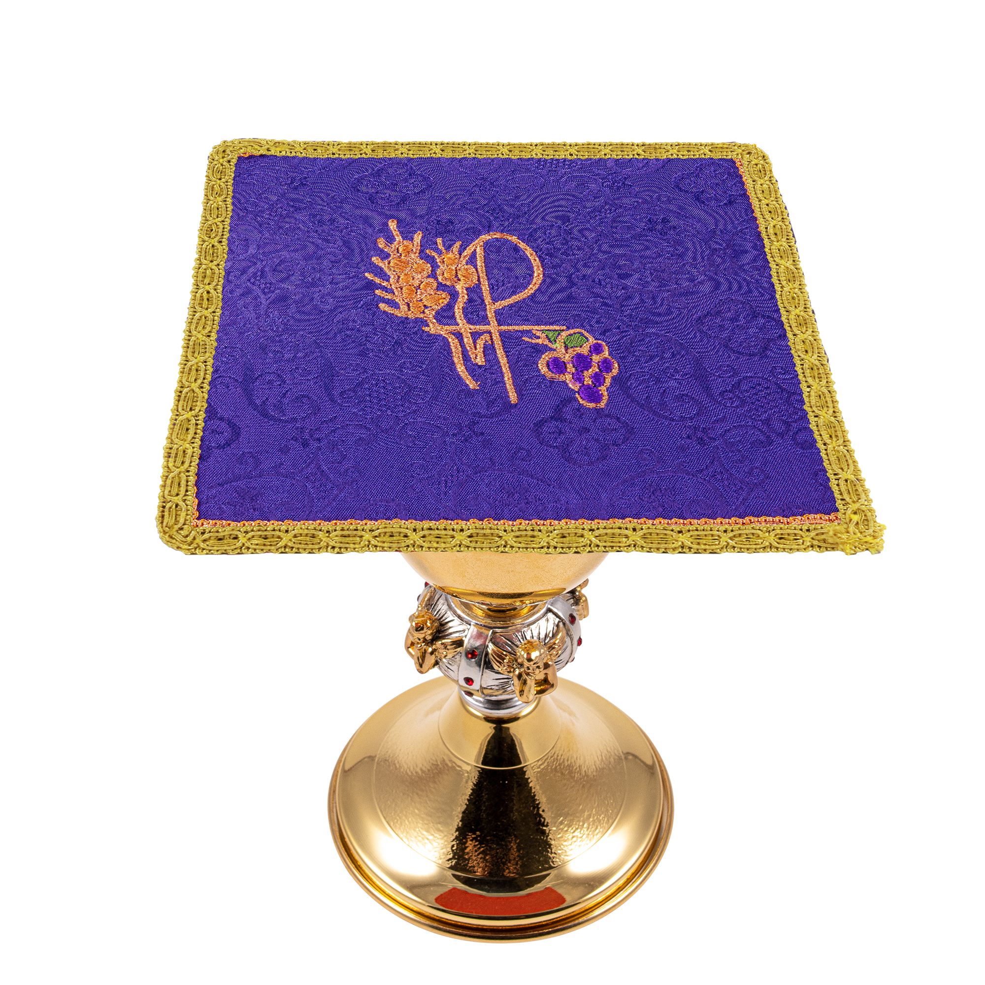 Rigid chalice pall covered in purple satin, with gold thread embroidery depicting the PX symbol with grapes and an ear of wheat.