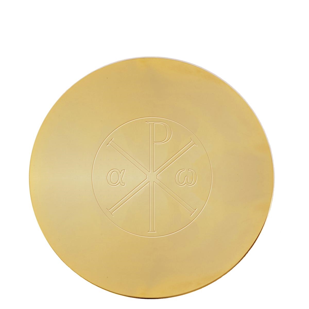 Patena in ottone dorato con immagine dell' Alfa e Omega.