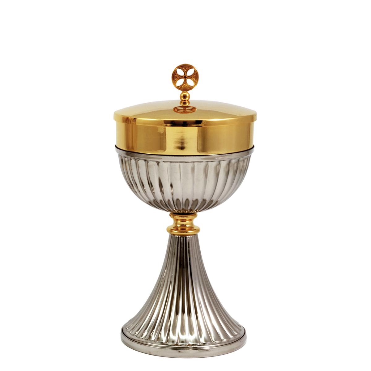 Chalice and Ciborium in gold plated brass with a base and saucer in a silver-tone finish with a distinctive groove. The Chalice is 20 cm tall and has a Ø 8.5 cm cup that can hold up to 200 ml of wine. The Ciborium is 16 cm tall and has a Ø 10 cm cup that can hold up to 100 hosts.