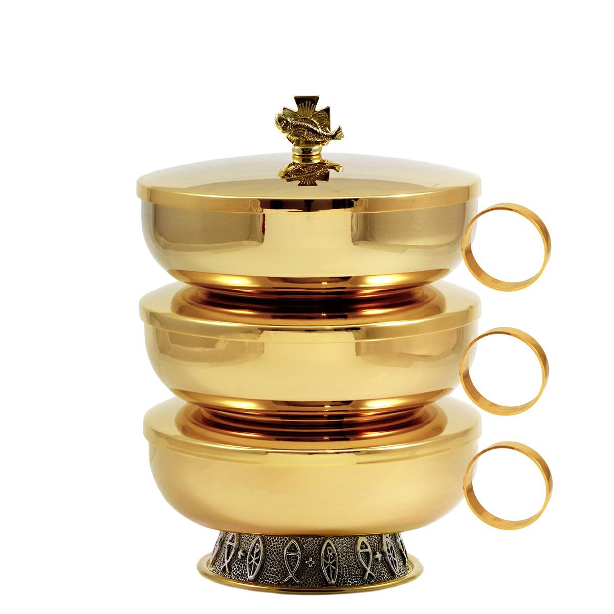 Pisside a 3 piani per concelebrazione in ottone su elegante base con decoro "Pesci e Px" in rilievo, in finitura argento antico.