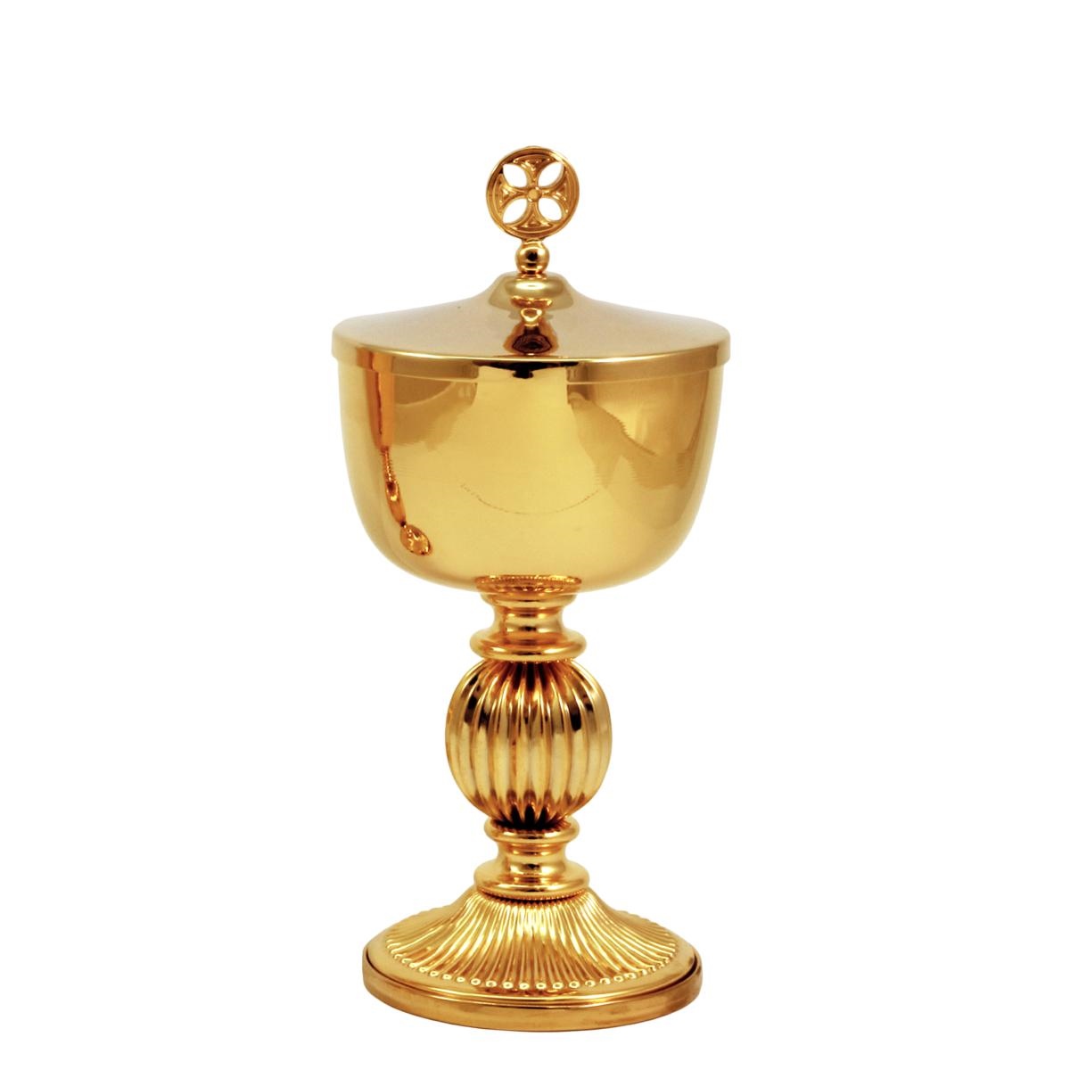 Travel chalice and ciborium in gold plated brass with a grooved base and knot. The chalice is 15 cm tall and has an 8 cm diameter cup that can hold up to 120 ml of wine. The ciborium is 15 cm tall and has an 8 cm diameter cup that can hold up to 80 hosts.