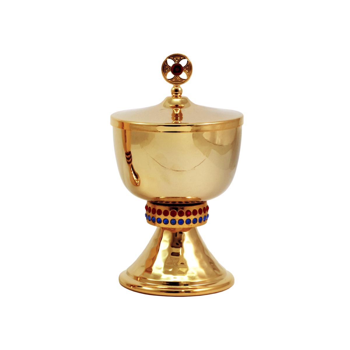 GOLD PLATED TRAVEL CIBORIUM WITH HAMMERING AND STONES