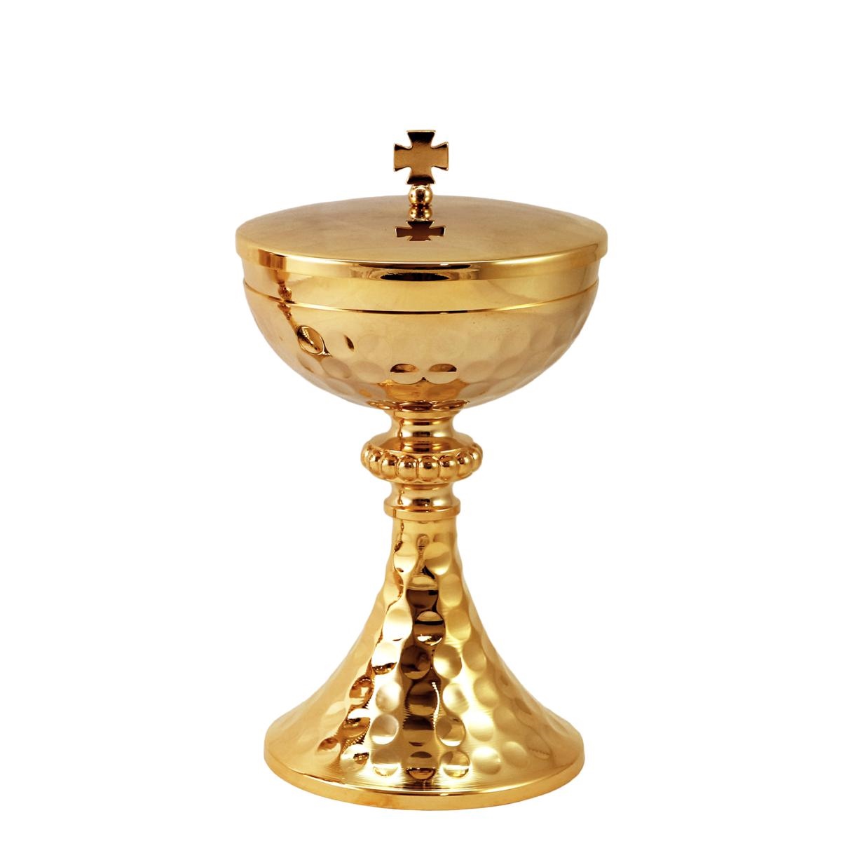 Calice e Pisside in ottone dorato con base e sottocoppa con martellatura e nodo perlinato.