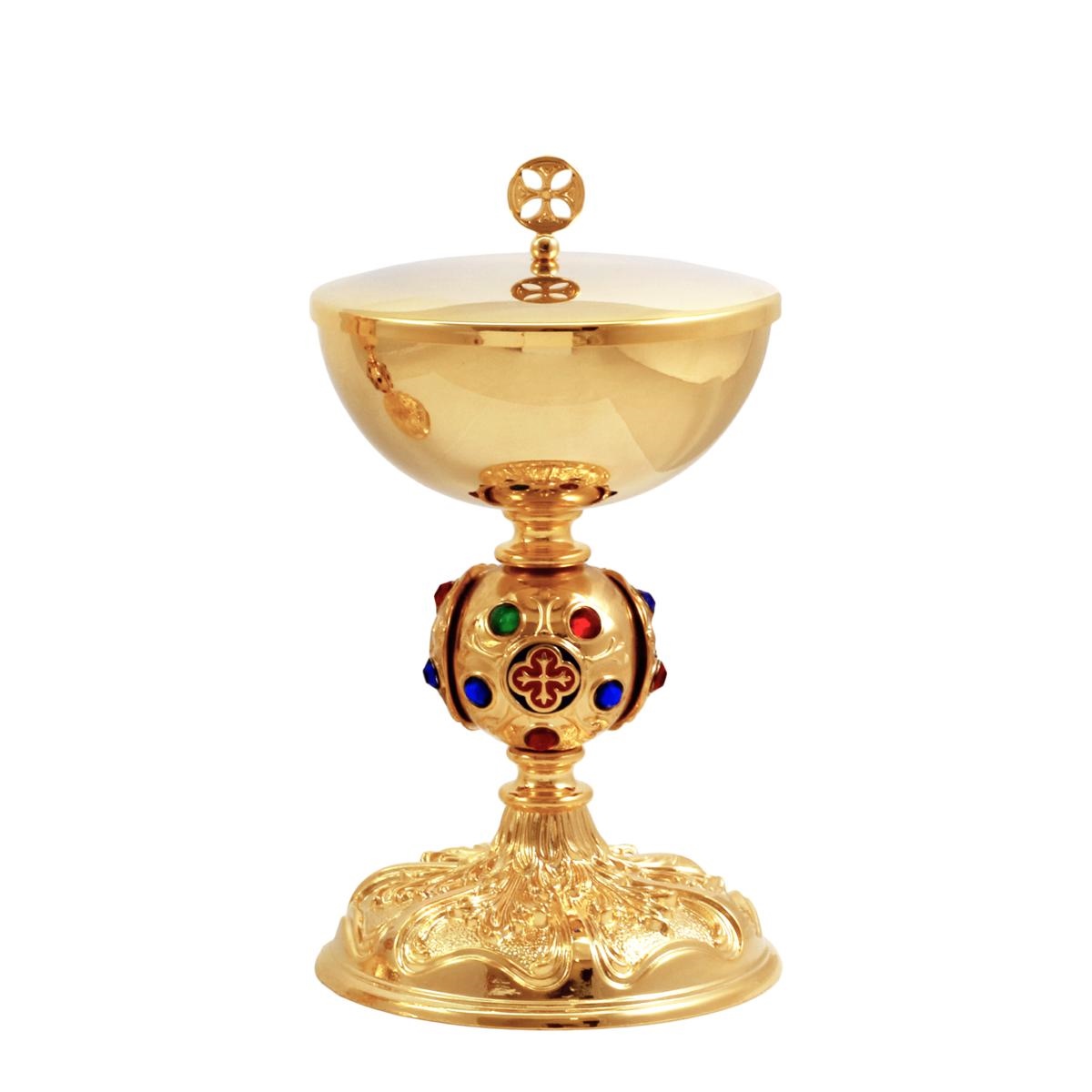 Calice e Pisside in ottone dorato con particolare nodo barocco con pietre e dettagli smaltati. La base è in fusione lavorata.