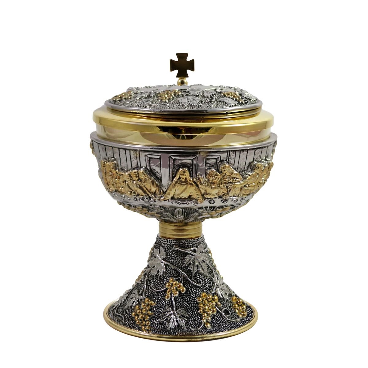 Calice e Pisside in ottone dorato con sottocoppa raffigurante l'Ultima Cena di Leonardo e base decorata con Uva e foglie di Vite in rilievo in finitura argento antico con dettagli oro.