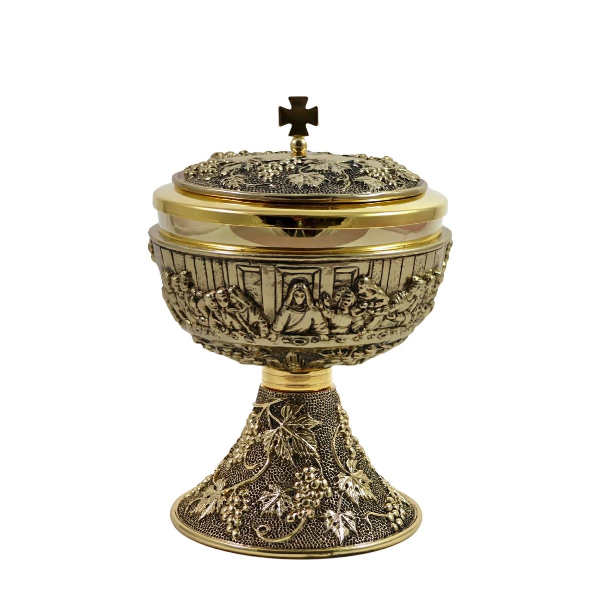 Chalice and Ciborium in gold plated brass with a saucer depicting Leonardo's Last Supper and a base decorated with grapes and vine leaves in relief in a burnished gold finish. The chalice is 18 cm tall and has a 10 cm diameter cup that can hold up to 350 ml of wine. The Ciborium is 15 cm tall and has a 12 cm diameter cup that can hold up to 150 hosts.