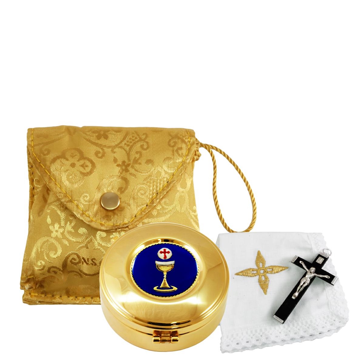 -Teca porta ostie in ottone dorato con placca decorativa smaltata a mano. La teca ha un diametro di 8 cm. e contiene circa 40 particole.
