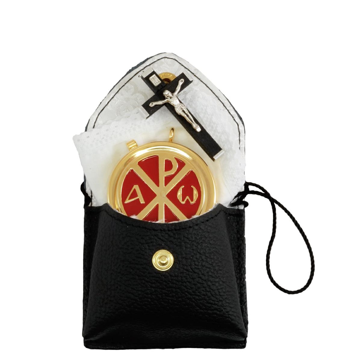 -Teca Eucaristica in ottone dorato con placca decorativa Alfa e Omega smaltata a mano. La teca ha un diametro di 5,3 cm. e contiene circa 12 particole.
