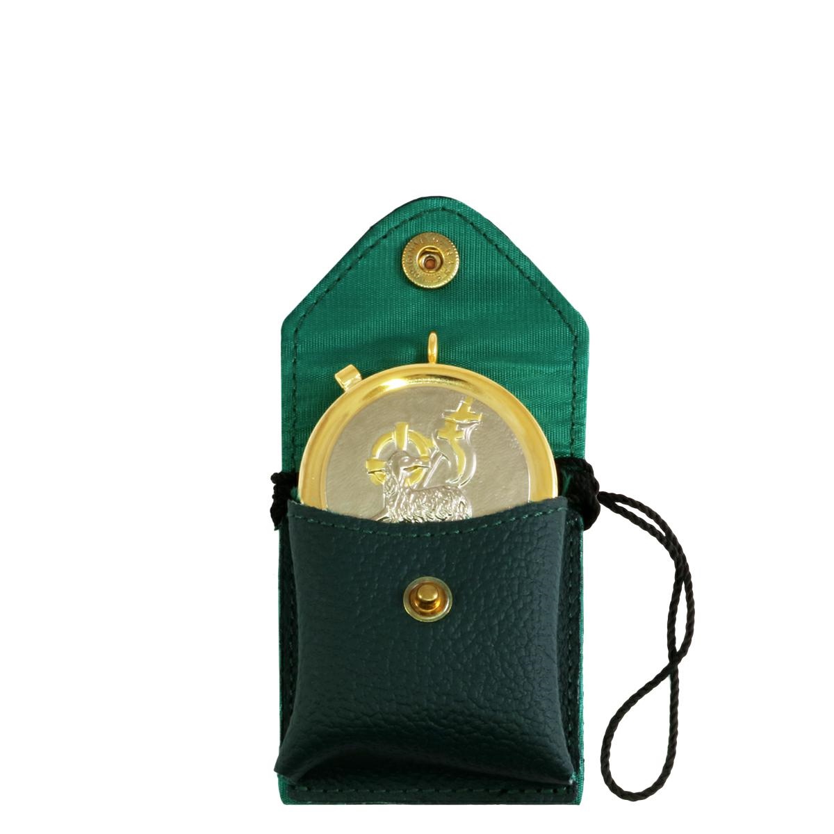 Genuine green leather pyx case, complete with a gold-plated brass Eucharistic pyx with a decorative plaque depicting the Lamb of Peace in a silver finish. The pyx has a diameter of 5.3 cm and holds approximately 12 hosts. Thanks to its practical cord, it can be easily worn around the neck. Dimensions: 6.5 x 7 cm.