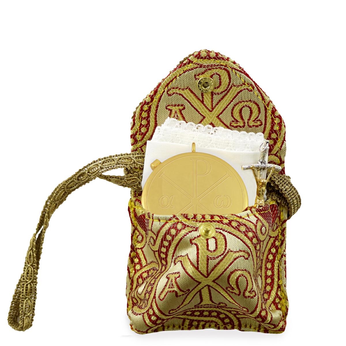 Porta teca foderato in pregiato tessuto broccato Alfa e Omega. Dotato di laccetto per portalo comodamente al collo.