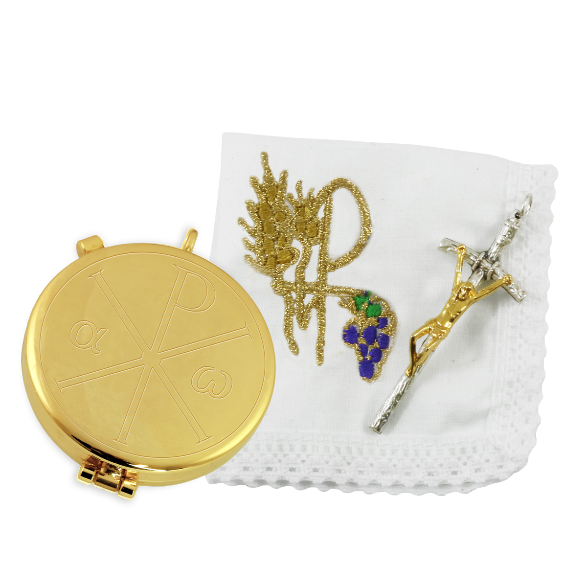 -Teca Eucaristica in ottone dorato con incisione Alfa e Omega. La teca ha un diametro di 5,3 cm. e contiene circa 12 particole.