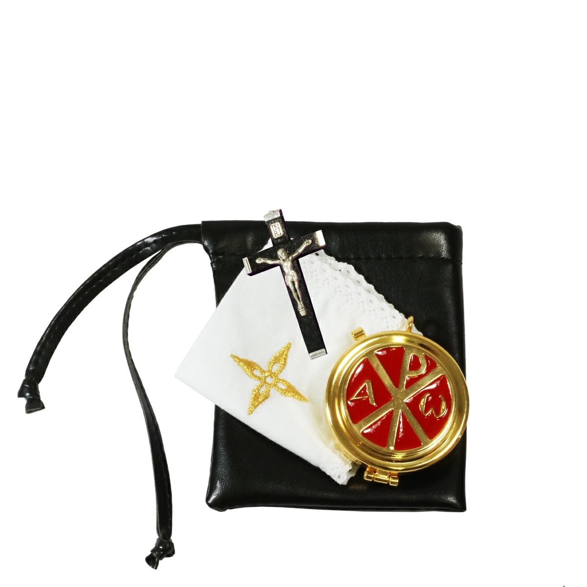 -Teca Eucaristica in ottone dorato con placca decorativa Alfa e Omega smaltata a mano. La teca ha un diametro di 5,3 cm. e contiene circa 12 particole.