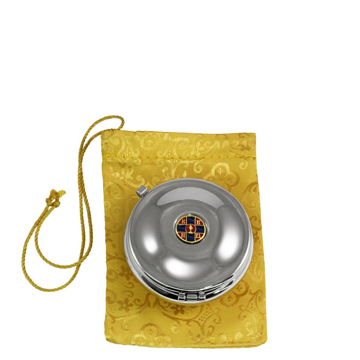 Sacchetto in Raso rosso completo di Teca eucaristica in ottone tono argento con placchetta decorativa smaltata a mano raffigurante un Calice dentro una Croce blu, su sfondo rosso.
