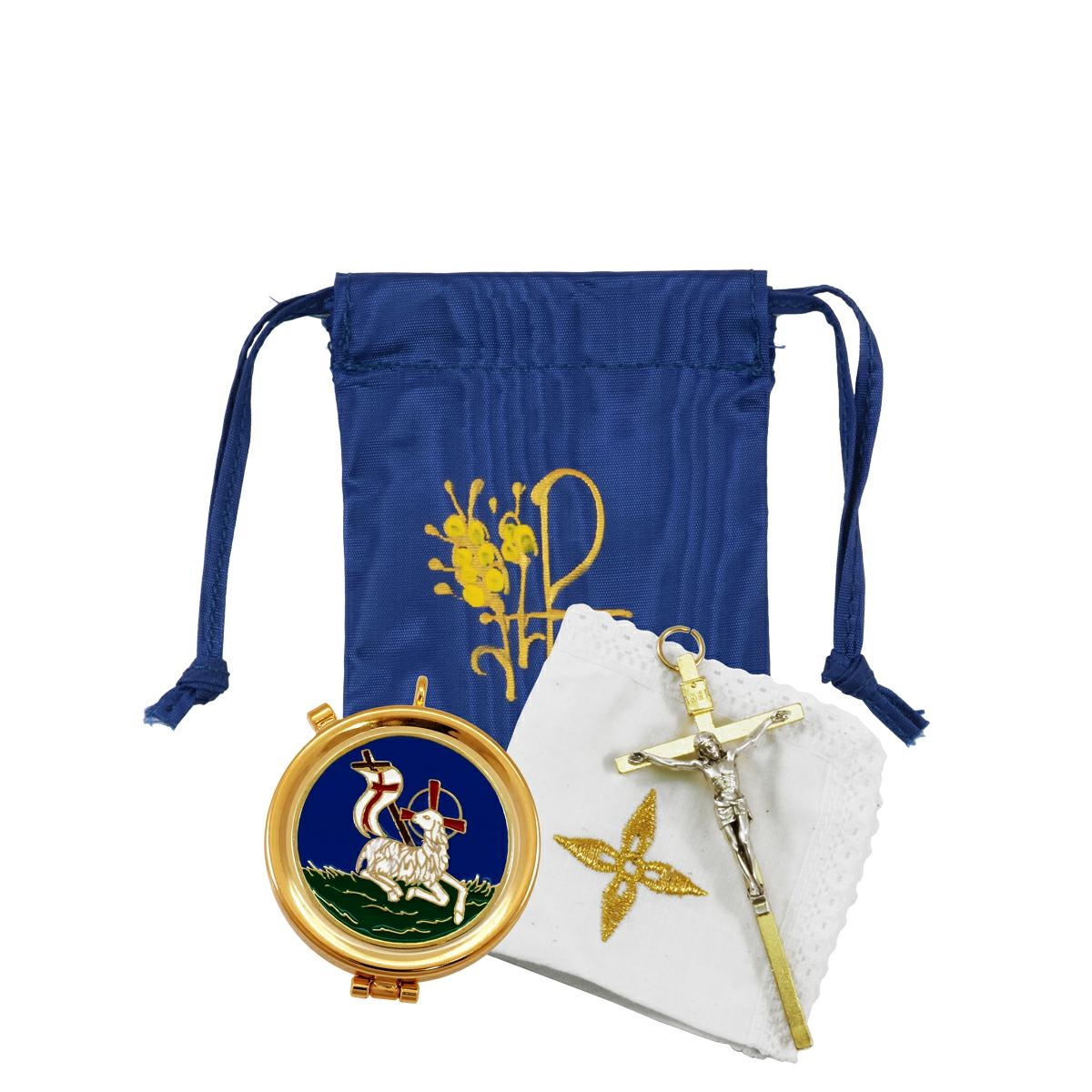-Teca Eucaristica in ottone dorato con placca decorativa smaltata a mano. La teca ha un diametro di 5,3 cm. e contiene circa 12 particole.