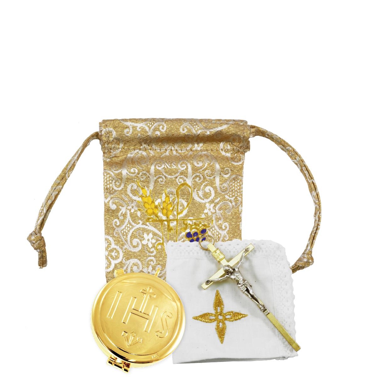 -Teca Eucaristica in ottone dorato con incisione IHS. La teca ha un diametro di 5,3 cm. e contiene circa 12 particole.