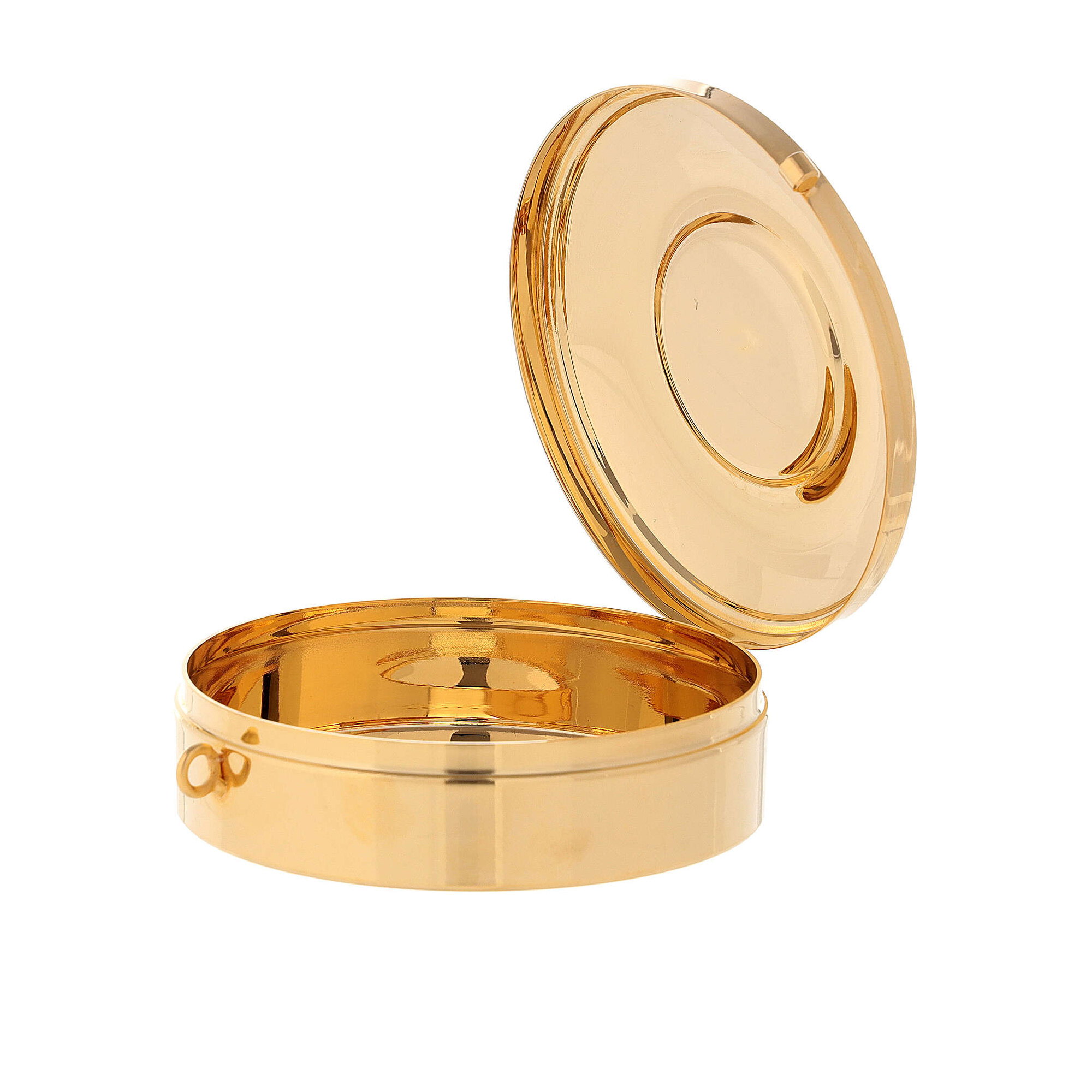 Host holder in gold plated brass with a decorative plaque in relief, depicting the Lamb of Peace on a blue background, hand-enamelled.