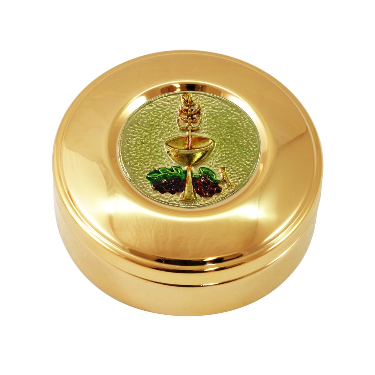 Host box in gold plated brass with a decorative plaque in relief, depicting a chalice and the IHS symbol in silver finish and hand-painted.