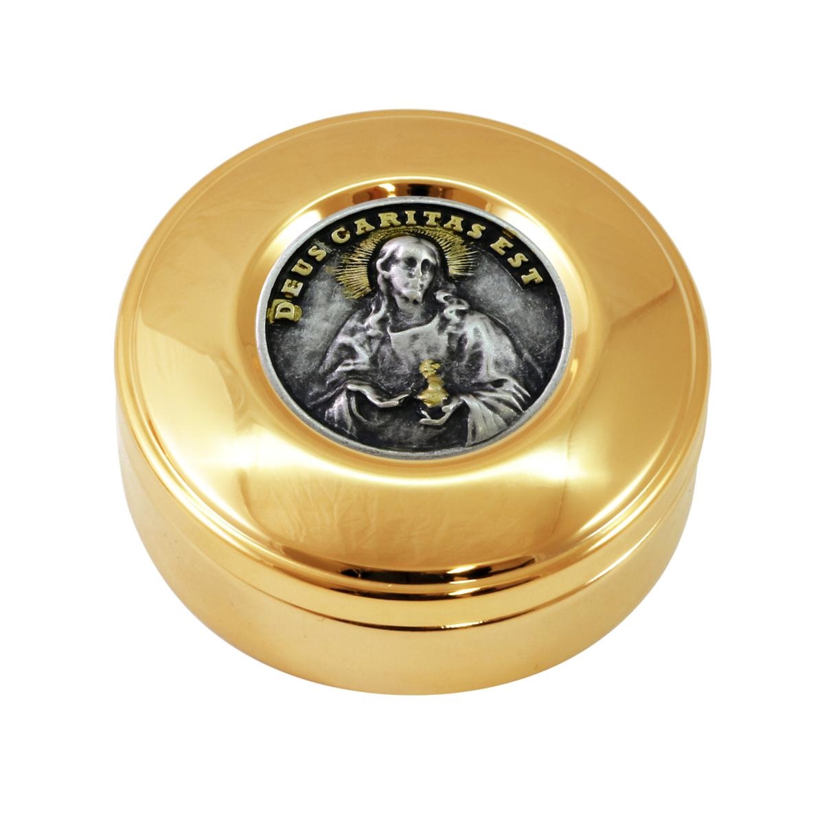 Host box in gold plated brass with a decorative plaque in an antique silver finish, depicting Christ with the inscription "Deus Caritas Est" above. The host box is available in the following sizes: - Ø 8.4 cm x height 2.5 cm. - Ø 9.2 cm x height 2.5 cm.