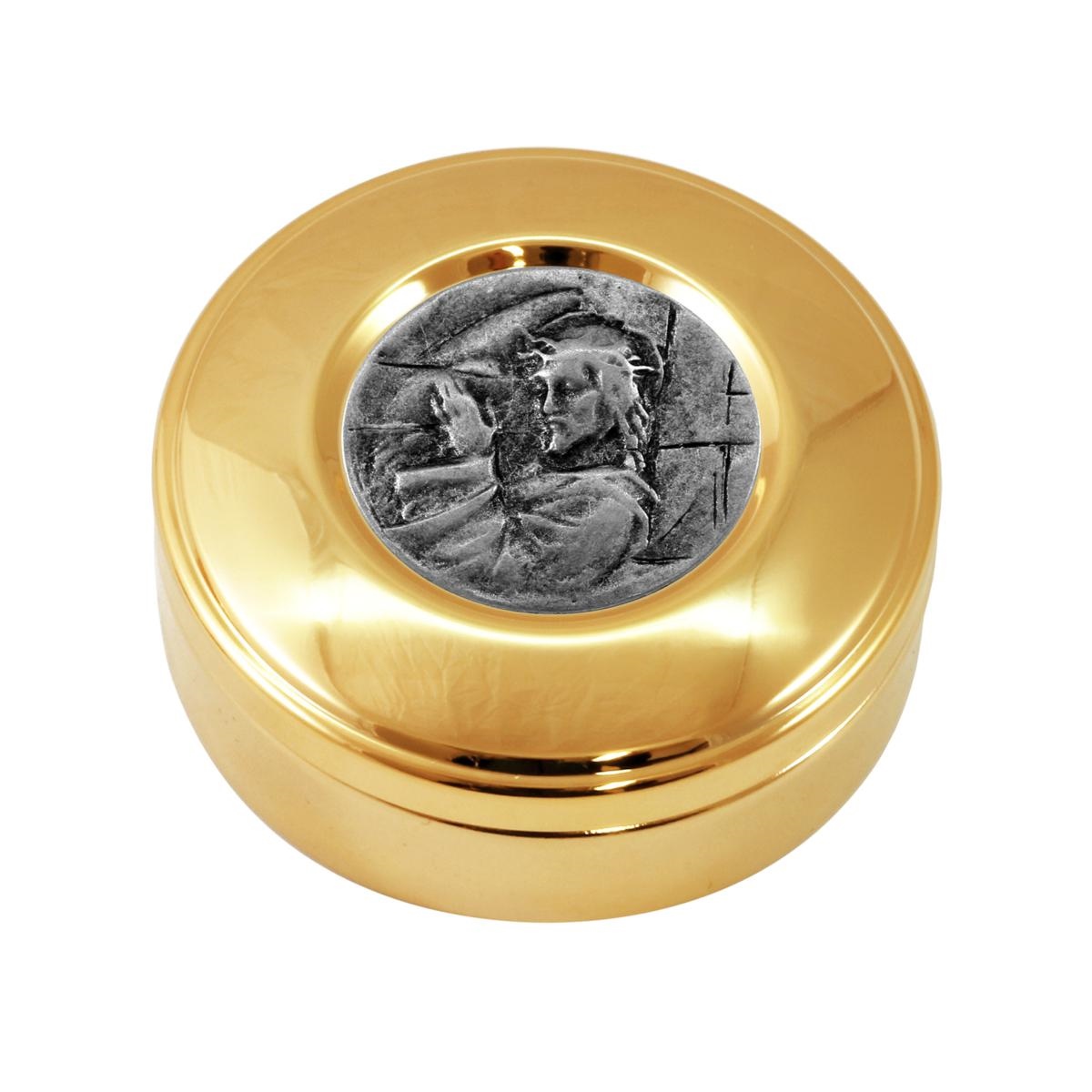 Host box in gold plated brass with a decorative plaque in an antique silver finish, depicting Christ with the Cross.