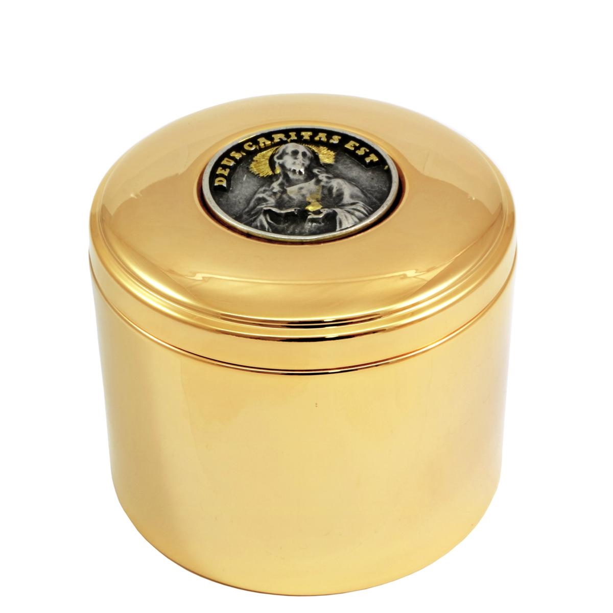 Scatola porta Ostie in ottone dorato con placca decorativa in finitura argento antico, raffigurante Cristo con sopra inscritto "Deus Caritas Est".