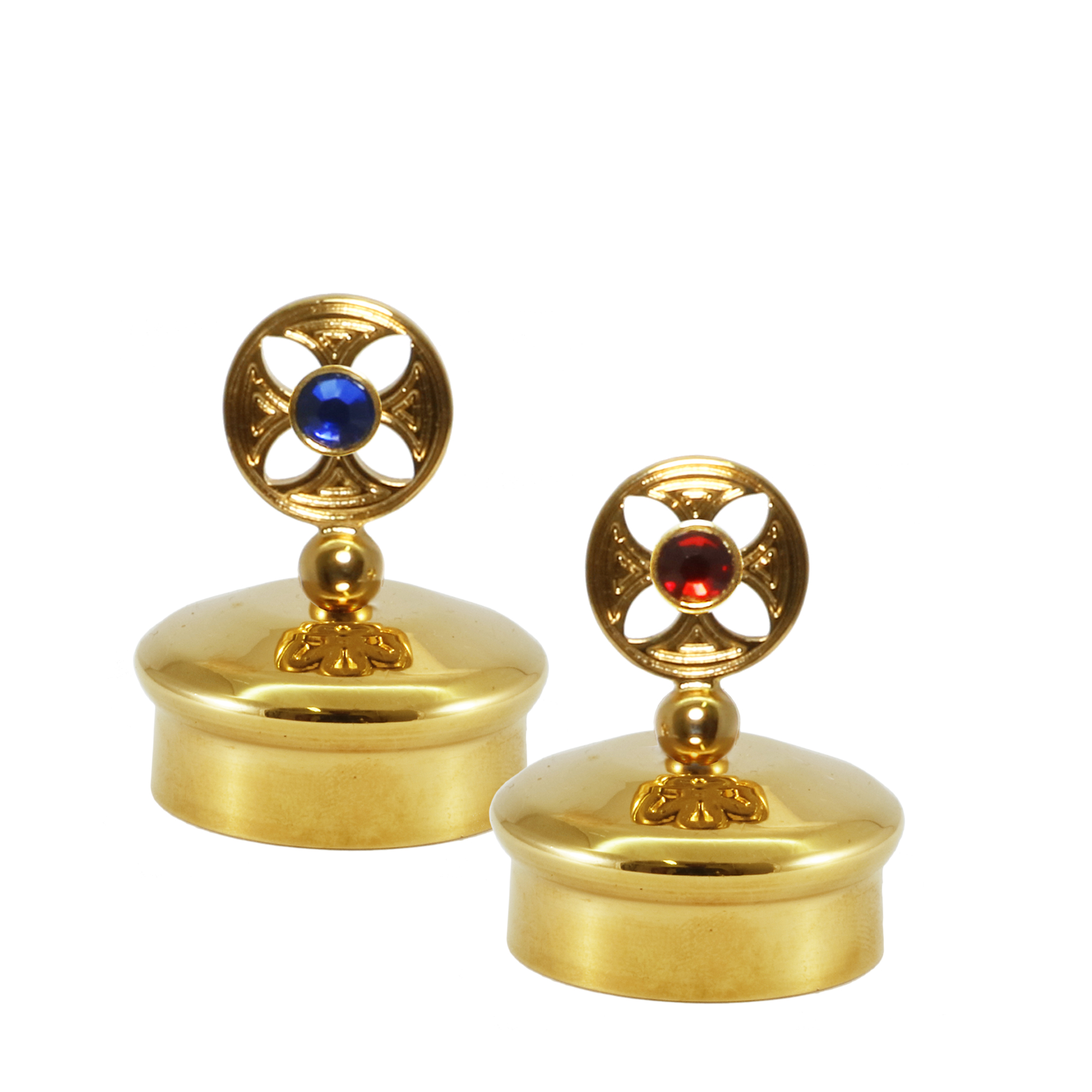 Two-tone water and wine set with a silver-tone brass plate and gold-plated handles decorated with red stones. Plate with two practical bases that hold the bottles and keep them stable when moving. "Bologna" model glass jugs with cast stoppers with gold-plated crosses.